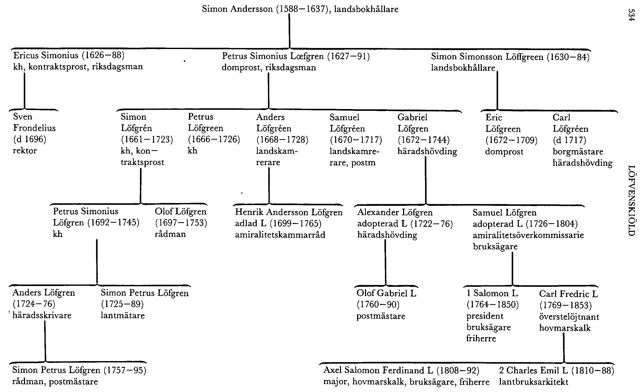 Källor o litt: Allmänt: W 25:18:1, f 48-50 (Henrik A L:s genealog ant:ar), LSB; Setterdahl, s 169; Örnberg, 10(1894), s 350-60. Erik Simonsson: BorgRP fbre frihetstiden (1933); Kj Kumlien, Västerås till 1600-talets början (1971). Simon Andersson: RKB 71 A: 3, Rikshuvudböcker 1624, f 699v, och 1628, uppslag 282, Smålands landskapshandl 1627:1, f 62v, Kalmar läns landsbok 1639, f 19, Kammar-kolhs kanslis arkiv B II a 1):18, f 335, RA; Kh 55 (Gamla domkyrkoboken), f 227v, 231, LSB; Kammarkoll:s prot, 1 (1934); A Kugelberg, Gamla Linköpingsgårdar,!—4 (1972—75); Magnus Haraldi, likpred över Simon Andersson (1638); A Sandberg, Linköpings stifts kyrkoarkivalier tom år 1800 (1948); SRP 6 (1891); STb från år 1592, 9, 14 (1968-79). Anders Nilsson: W 25:18:1, f 48v, LSB; M Collmar, En stallmästares jordafärd (Sörmlandsbygden 1958); C Fägerskjöld, Samuel Nilsson Ross till Hässlö (PHT 1960); Lokalf. Ericus Simonius: Biographica, Likv, RA; uppgift om inskriptionen på hans gravsten i Vadstena klosterkyrka, Sveriges kyrkors redaktion, Sthlm; Frälseg 3:1—2 (1947); Kugelberg, a a; Linköpings hm, 2 (1919), s 391-94; Oden; PrRP 2, 4 (1954-62); Sandberg, a a. Sven Frondelius: V Lagus, Åbo akad:s studentmatr 1640-1740 (1891); Linköpings hm, 2 (1919), s 391; Setterdahl, s 169. Simon Simonsson Lojfgreen: Biographica, J A Almquists lappkatalog över kamerala tjänstemän efter 1630, Börje Cronbergs saml, vol 33, E 2094 (skr till Nils Bielke), RA; Nissafors bruksarkiv 6 A: 36 (epitafietext i Västerås domkyrka), Länsmuseet, Jönköping; E Wetter-gren, Min mödernesläkt (SoH 1954). Eric Löfgreen: H Almquist, Gbgs hist, 2 (1935); Gbgs hm; [A Westén,] Sv kongl hof-clericiets hist, 1:2 (1801); Västmanlands-Dala nations album, 1 (1931 — 72). Carl Löfgreen: Biographica, Likv, RA; C M Kjellberg, Norrtälje stad 1622-1922 (1922), s 46; Lags och doms; F V RadlofT, Beskrifn öfver norra delen af Sth, 1 (1804), s 78, 2 (1805), s 212; Västmanlands-Dala nations album, 1 (1931 — 72). Petrus Simonius Lcefgreen: Biographica, RA; uppgift om inskriptionen på hans gravsten i Linköpings domkyrka, Sveriges kyrkors redaktion, Sthlm; J Bergman, Univ i Dorpat under sv tiden (1932), s 49 f, 181; F K Gadebusch, Livländische Bibliothek, 3 (1777), s 138 f; F Lindberg, Samhälls- o kulturliv (Linköpings hist, 3, 1975); Linköpings hm, 1 (1919), s 184 f; Oden; PrRP 3-4 (1956-62); Sandberg, a a. Petrus Löfgreen: Frälseg 4:2—3 (1976); Linköpings hm, 4:2 (1925), s 301; Oden. Samuel Löfgreen: Kans-likolhs arkiv: Skr från postkontor; Overpostdirek-törens huvudarkiv E 3 D: 75, Likv, RA; Nissafors bruksarkiv 21 E:l, Länsmuseet, Jönköping; Grape. Simon Löfgren: Kugelberg, a a; Linköpings hm, 3 (1919), s 504 f; Oden; PrRP 4 (1962); Sandberg, a a. Olof Löfgren: Hollandica vol 727: Åtskillige länsstyrelser o magistrater: 1734, RA; Oden; E Ringborg, Till Norrköpingskrönikan, 4-5 (1921-22); Setterdahl; H O Sundelius, Norrköpings minne (1798), s 476. Petrus Simonius Löfgren: C Echman, likpred (1745); Linköpings hm, 3 (1919), s 585 fT; Oden. Simon Petrus Löfgren (d 1789): Biographica, RA; Ekstrand; Oden. Simon Petrus Löfgren (d 1795): Overpostdirektörens huvudarkiv E 3ID: 146, RA; Grape. Anders Löfgreen: Biographica: Löfvenskiöld, Kammarkolks kanslis arkiv H I a: 5: 18 maj 1710 (nr 3) o H I a: 9: 26 jan 1723, Likv, RA; Frälseg 3: 1—2 (1947); P Norberg, Avesta under kopparbrukets tid, 1—2 (1956). Henrik Andersson L: Biographica L 47 o 50, Adelsbrev, vol 23, Ericsbergsarki-vets autografsaml, RA; Nissafors bruksarkiv 6 A: 8, 11, 15 o 20, Länsmuseet, Jönköping; Orig:genealo-gierna (släktredovisn av L), RHA; S Bergh, Ur Anders Anton v Stiernmans brefväxl (PHT 1916); Biogr lex öfver namnkunnige sv:e män, Ny revid uppl, 8 (1876); Broomé; Carlander, 4:2, s 948 f; G Gezelius, Försök til et biographiskt lexicon ..., 2 (1779); E Ingers, Erik Lindschöld (1908), s 7; J Kleberg, Amiralitetskoll—marinförvaltmen, biogr ant:ar 1634-1934 (1934); dens, Kammarrevisionen—kammarrätten 1695—1940 (1940); Oden; PrRP 7 (1975); H Sallander, Några ant:ar om Anders Anton v Stiernmans biogr o geneal arbeten (PHT 1944- 45); SMoK; O Sylwan, Sv pressens hist till statshvälfningen 1772 (1896). Gabriel Löfgren: Biographica, Genealogica, vol 241, Sköldebrevsamhen, Ericsbergsarkivet: Familjen Stenbocks papper, vol 45, RA; Nissafors bruksarkiv 6 A: 1-3, 5-10 o 21 G: 1-16, Länsmuseet, Jönköping; P Johnsson, Villands domsaga o dess häradshövdingar (Handhar ang Villands härad, 5, 1945), s 32; G Johannesson, Stadens styr o förvalta (Hälsingborgs hist, 4:1, 1969); Lags o doms; A Åberg, Den politiska historien 1658—1718 (Hälsingborgs hist, 4:1, 1969). Alexander L: Genealogica, vol 241, Sköldebrevsamhen, Krigsexp:s arkiv A I a a: 53 (rådsprot 1758), f 843v, Ericsbergsarkivets autograf-saml, RA; Nissafors bruksarkiv 6 A: 14, 16, 26—28 o 73 D: 7, Länsmuseet, Jönköping; B Edlund, Ofrälse studenter utanför nationsindelningen 1710-1844 (1981); Lags o doms. Samuel L: Biographica, Sköldebrevsamhen, Krigsexp:s arkiv A I a a: 53, f 843 v, Kommittéarkiv 220 (Fideikommissut-redn): 1 o 3, RA; Nissafors bruksarkiv 6 A: 9, 10, 12-28, 32, 21 I: 1-7, 24 Ab: 16-19, 22-23, 25-27, 24 Ac: 1-4, 24 Ad: 4, 7-9 o 14, 24Ae: 2, 6, 9-11, 14-16 o 21-23, 73 A: 2-3 samt 73 D: 7 o 25, Länsmuseet, Jönköping; Edlund, a a; Gbgs eskader o örlogsstation 1523-1870 (1949); S Högberg, PS:s hist (1961); dens, Matr över ledamöter i PS 1766–1815 (1961); Kleberg, a a 1934; S A Leijonhufvuds minnesant:ar (1919); J Rosengren mfl, Ny Smålands beskrifn, Västbo härad (1914), s 795 IT, 799, 801 f; I Seth, Univ i Greifswald o dess ställn i sv kulturpolitik 1637—1815, Zusammenfassung o bilagor (1952), s 27; G Utterström, Jordbrukets arbetare (1957), 1, s 303, 318, 2, s 306; E Åkerhielm, Småländska fideikommiss (1904), s 145 f; dens, Sv gods o gårdar, 2. uppl, 2 (1930), s 427, 581. Olof Gabriel L: Grape; S