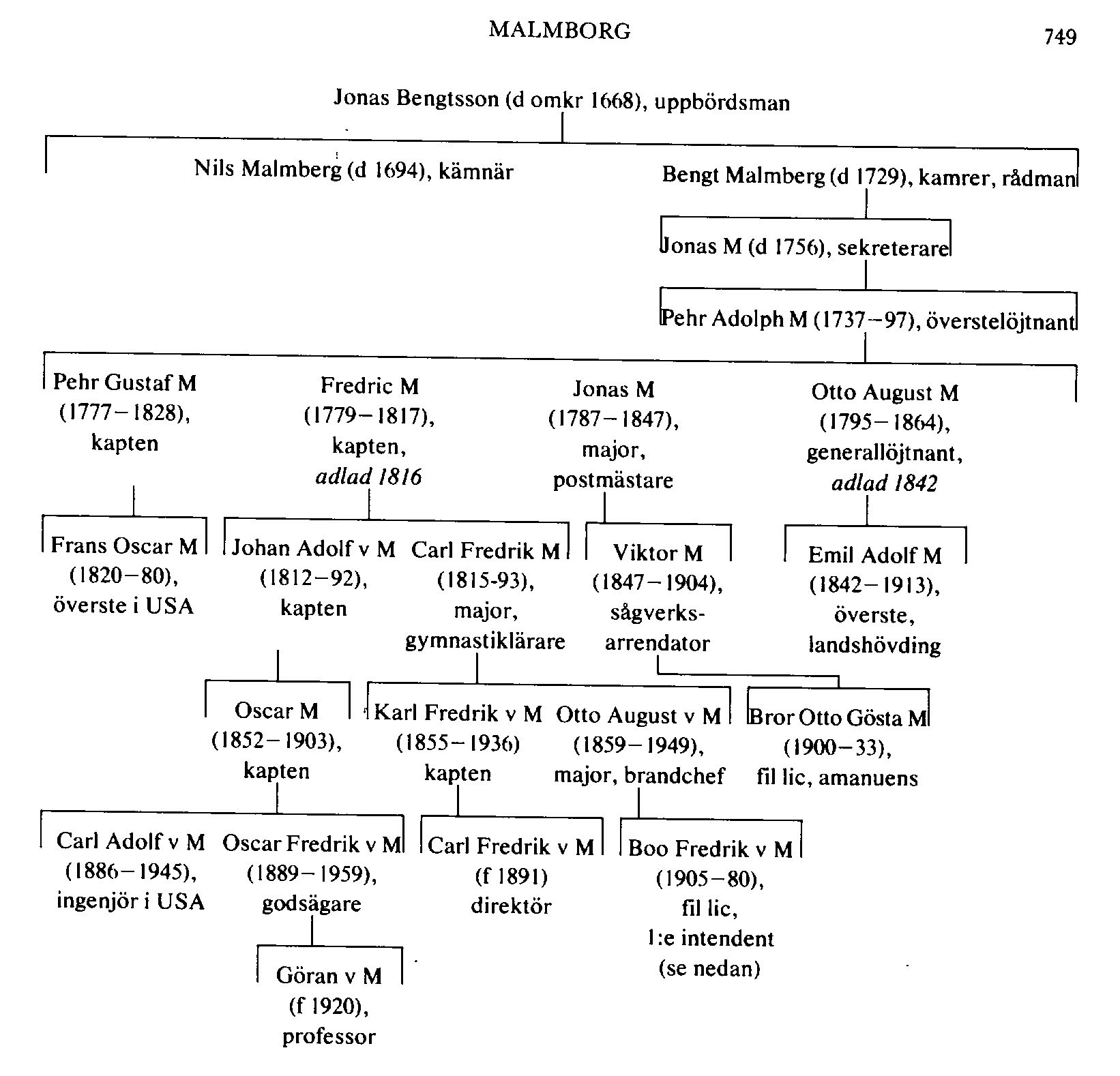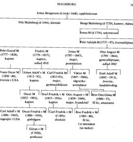 Malmborg (von M), släkt, härstammande från uppbördsmannen Jonas Bengtsson (d omkr 1668) i Sala, som var far till kämnären där Nils Malmberg (d 1694). Dennes bror kamreraren och rådmannen där Bengt Malmberg (d 1729) var i äktenskap med en dotter till prof Petrus Hoffwenius (bd 19) far till Jonas M (d 1756, 60 år gammal). Denne skrev avhandlingen De pictura (1717), som är den första sv översikten av konstens utveckling från gammal konstlös målning fram till den samtida europeiska konsten. För denna framställning har han utnyttjat såväl sv som tysk, fransk och holländsk litteratur. Efter anställningar i olika ämbetsverk blev M slutligen sekreterare vid generaltullarrendesocietetens fullmäktiges kansli i Sthlm, men han var även verksam som konstnär. Han har efterlämnat en signerad tuschlavyr av morfadern (KB) och anses också ha målat det porträtt av densamme som återges i bd 19, s 187. 1740 publicerade M en sv översättning av skotten John Barclays 1621 tryckta uppfostringsroman Argenis, som på grund av sitt stora omfång ej tidigare översatts i Sverige. I sitt första äktenskap – med en dotterdotter till prof Harald Vallerius – var han far till Pehr Adolph M (1737–97), som deltog i pommerska kriget och sjöslagen vid Svensksund 1789 och 1790. I det senare av dessa förde han befäl över en division av skärgårdsflottan (jfr bd 10, s 158) och blev sårad. M var 1790–94 överstelöjtnant och köpte därefter säterirusthållen Härkälä och Salmi i Vichtis, Nylands län. I sitt äktenskap med en kusindotter till sedermera fältmarskalken och greven Johan Christopher Toll hade han femton barn.