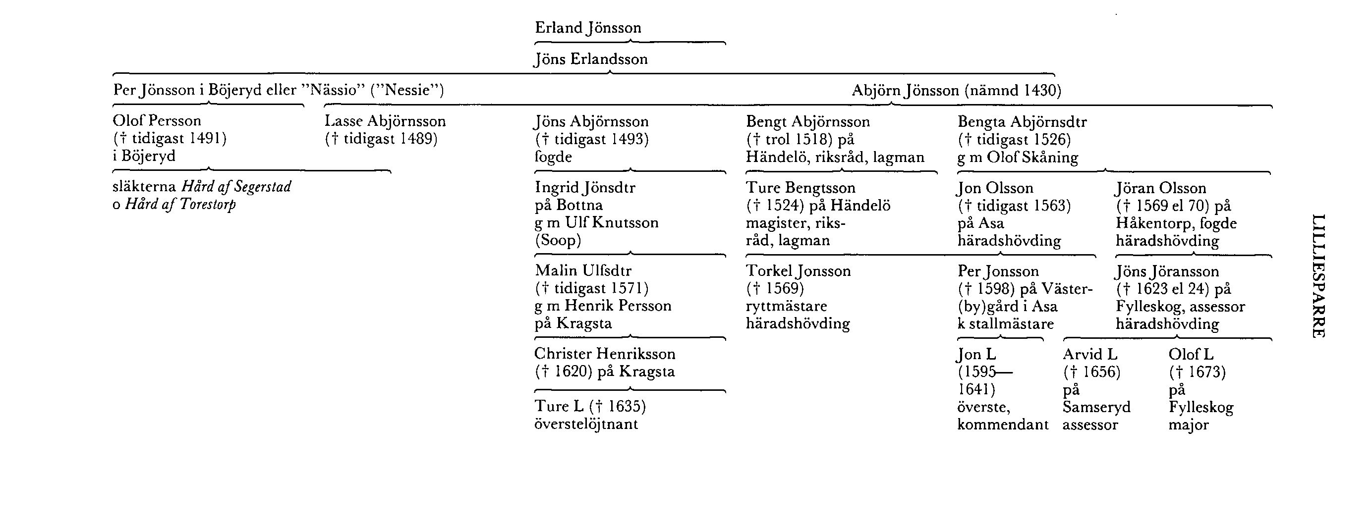 Lilliesparre, frälsesläkt, som i sitt vapen förde tre liljor ovanför en sänkt sparre. Dess stamfar uppges (Biskop Hans Brasks släktbok; Anna Pedersdtr Bielkes släktbok) ha varit en Erland Jönsson, vars sonson Per Jönsson skall ha bott i Böjeryd i Gryteryd, Jönk (Brask), eller i ett svåridentifierat "Nässio" (Bielke) eller "Nessie" (Genealogica) o varit far till Olof Persson (d tidigast 1491) i Böjeryd, vars söner upptog släktnamn från mödernet o blev stamfäder för de släkter som på Riddarhuset kallats Hård af Segerstad o Hård af Torestorp (bd 19).