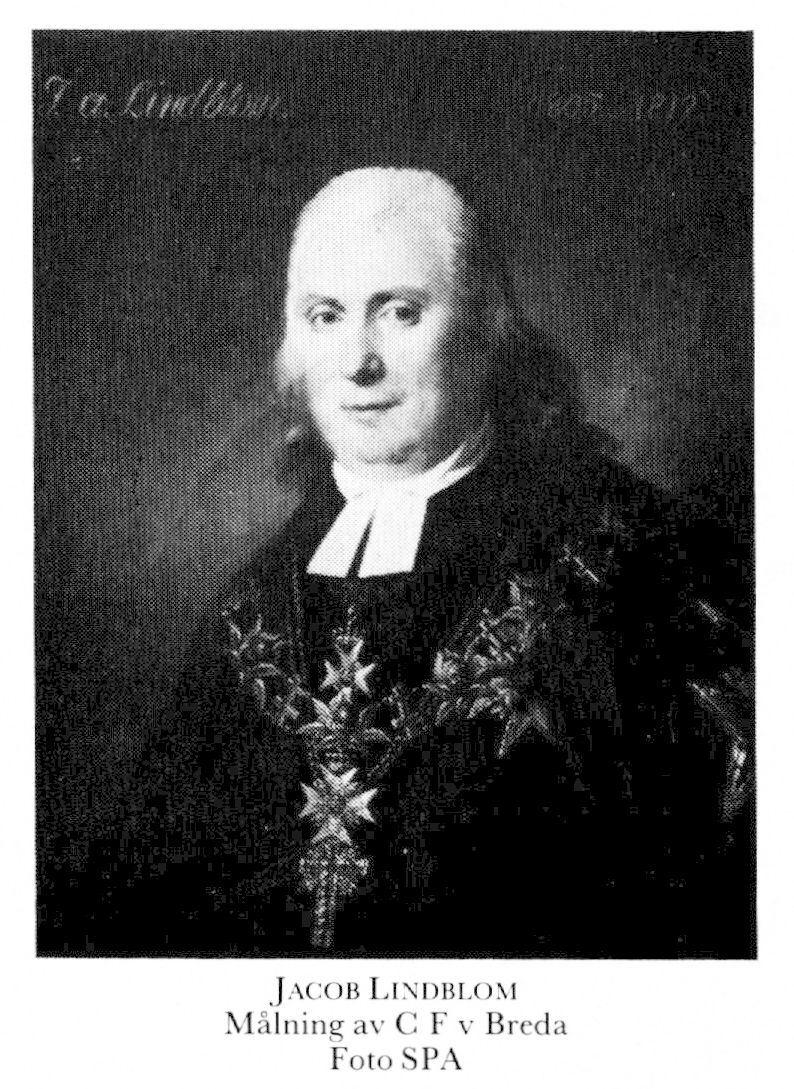 1 Lindblom, Jacob, f 27 juli 1746 på Blackebo, Skeda, Ög, d 15 febr 1819 i Uppsala. . Föräldrar: kontraktsprosten teol dr Axel Johan L o Regina Margareta Paravicino (Bouppt 1717:247, SSA; jfr Örnberg, 7, s 420). Inskr vid UU 4 okt 63, informator i Livland 64-66, mag vid UU 18 juni 70, eo amanuens vid UUB 72, doc i latinsk vältalighet vid UU 3 juni 73, ord amanuens vid UUB 18 okt 73, v bibliotekarie 1 febr 76, eo prof vid UU 12 juni 79, skytteansk prof 7 febr 81, biskop i Linköping 14 dec 86 (tilltr 87), prästv i Sthlm 19 dec 86, riksbanksrevisor 88, deltog i riksdagarna 89—18 (talman i prästeståndet 09—18), revisor i riksgäldskontoret 91, TD 6 juni 93, ärkebiskop o prokansler vid UU 1 mars 05 (tilltr 06), ordf i psalmboks-komm okt 11—jan 19, i uppfostringskomm jan 12—april 17, i komm ang uppläsandet av förordn:ar från predikstolen mars 13—juni 14, i bibelkommissionen 16, i komm ang förbättrad evangeliebok 16—febr 18. — LVVS 74, LVS 84, HedLVHAA 01, LSA 09, serafimerriddare 18.