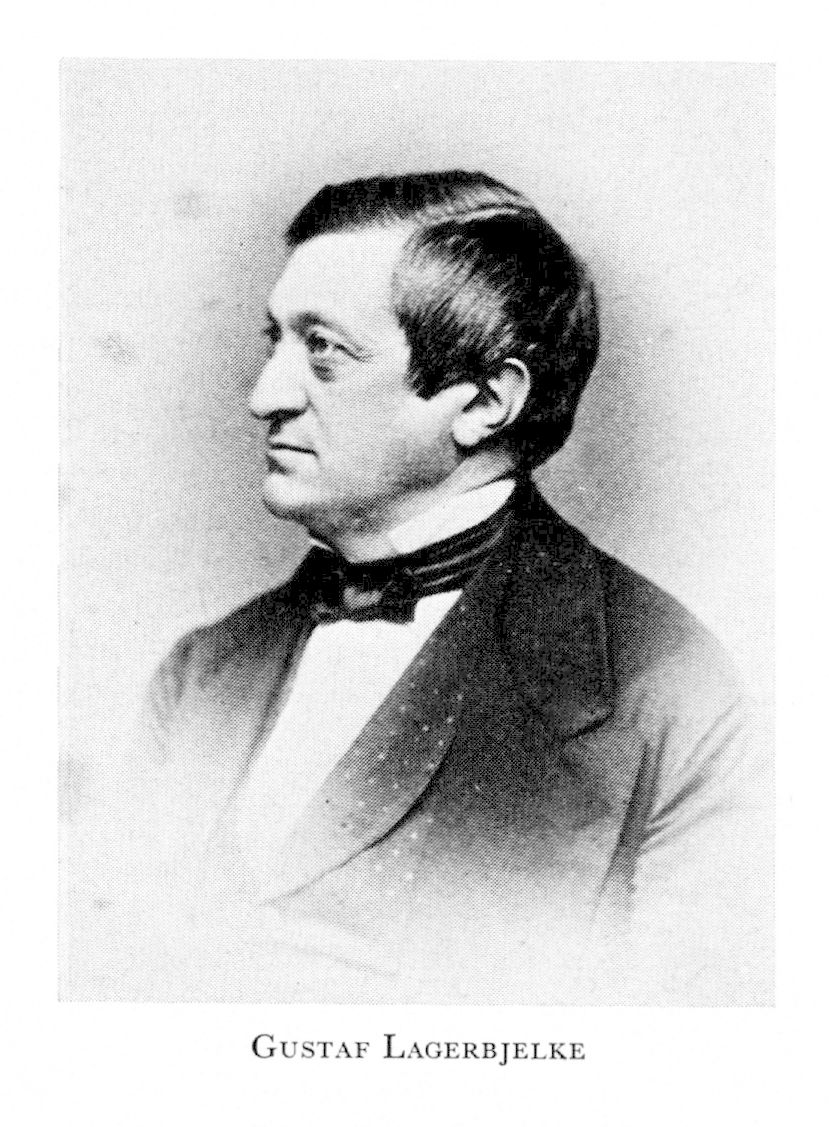 3 Lagerbjelke, Gustaf, brorson till L 2, f 6 okt 1817 i Sthlm, Skeppsh, d 6 mars 1895 i Sthlm (enl db för Brännk, Sth). Föräldrar: översten greve Axel L o frih Carolina Antoinetta Cederström. Greve vid faderns död 32, inskr vid UU 13 juni 34, jur fil ex 4 juni 36, jur utr kand 17 dec 38, auskultant i Svea hovrätt 24 jan 39, eo kanslist i justitierevisionen 26 jan 39, led av ridderskapet o adeln vid riksdagarna 44–66, av FK från 67 (led av exp:utsk 44–45, av KU 47–58, ordf där 51–58, led av bevilln:utsk 47–48 o 59–60, av förstärkta statsutsk 50–54 o 59–60, av förstärkta bankoutsk 53–54 o 59–60, av statsutsk o förstärkta bevilln:utsk 56–58, av förstärkta lagutsk 59–60, lantmarskalk 62–63 o 65–66, talman i FK 67–76 o 81–91), ordf i riksgäldsfullm 19 april 48–18 mars 57, i komm ang städernas beskatta mars 52–febr 54, i riksbanksfullm mars 57–våren 58, landsh i Södermanlands län 27 april 58–31 dec 88, ordf i hushålln:sällsk där 59–69 o 71–88, led av komm ang föreningsakten mellan Sverige o Norge febr 65–aug 67, ordf i komm ang ensk järnvägsbyggnader aug 69–aug 70, i styr för Oxelösund-Flen-Westmanlands järnvägsab 73–94, i bankokomm nov 81–dec 83. – LLA 48, Serafimerriddare 66, HedLLA 70, jur hedersdr vid UU 6 sept 93.