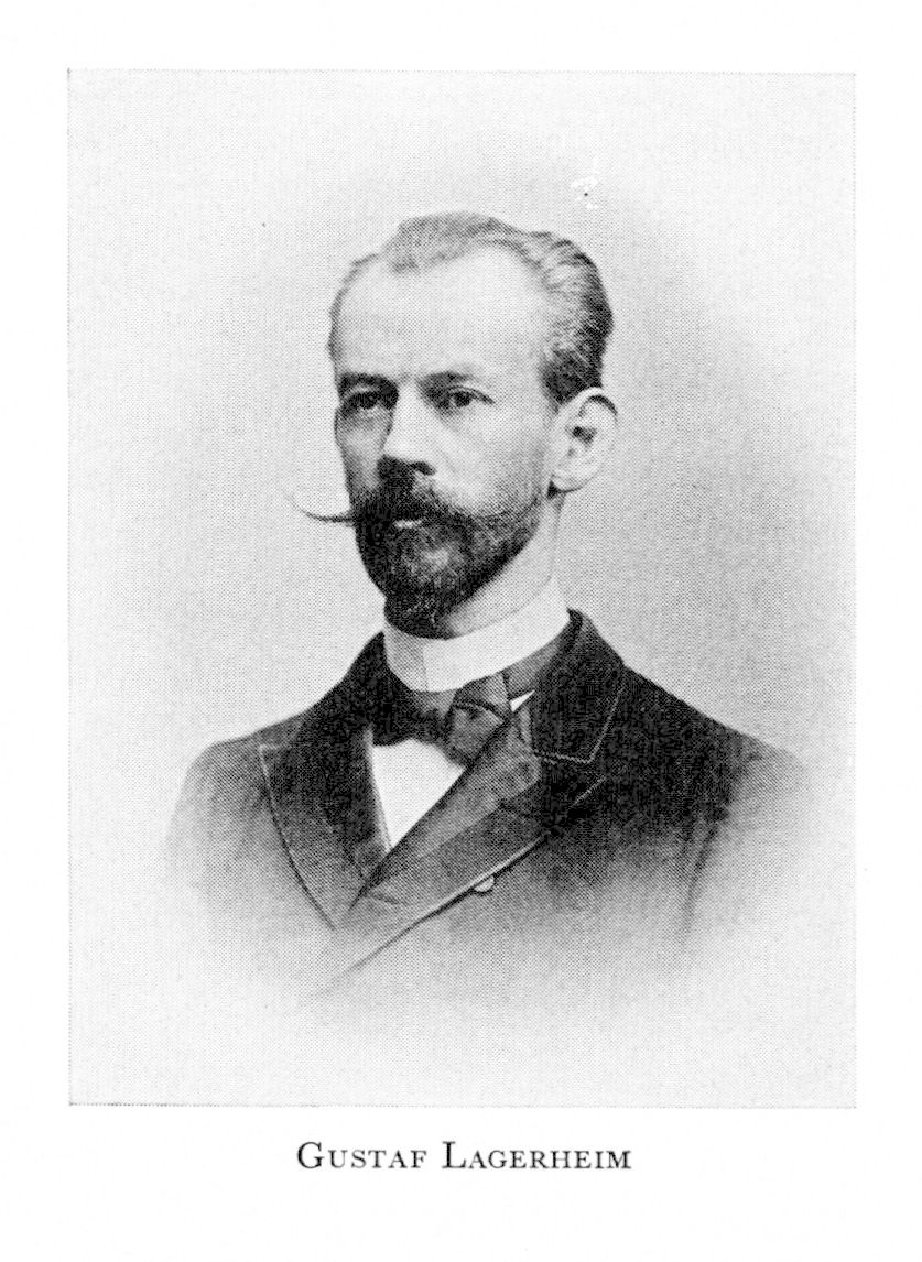 3 Lagerheim, Nils Gustaf, f 18 okt 1860 i Sthlm, Klara, d 2 jan 1926 i Djursholm. Föräldrar: byråchefen Nils Olof L o Emma Gustava Landergren. Mogenhetsex vid Sthlms gymn 20 maj 80, inskr vid UU ht 80 o 82—85, vid StH 81, vid univ i Berlin 86, i Freiburg 87—89 o i Montpellier 89, assistent vid polytekn skolan i Lissabon 1 juli 89, prof i kryptogami o dir för botan trädgården vid univ i Quito 89, konservator vid museet i Tromsö 23 nov 93, prof i botanik vid StH 4 nov 95—25, led av styr för Farmaceutiska inst 01—21, ordf i Botan sällsk i Sthlm 15— 19. — Fil hedersdr vid UU 6 sept 93, LVA 09, LLA 15, LVS 22.