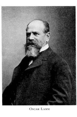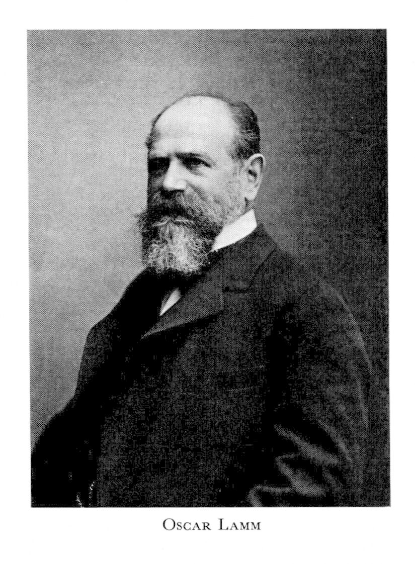 1 Lamm, Oscar Ludvig, f 8 juni 1848 i Sthlm, Mosaiska, d 24 sept 1930 där, Engelbr. Föräldrar: grosshandl Ludvig L o Fanny Goldschmidt. Studentex vid Sthlms lyceum vt 66, brukselev vid Älvsbacka, Värml, 66— 67, inskr vid UU 20 sept 67, ex till bergsstaten där ht 73, e elev vid bergsskolan i Sthlm 73—74, föreståndare för masugnar o kanongjuteri i Finspång 74—76, studieresor till Tyskland, Österrike, Frankrike o England 76—77, inneh kemiskt laboratorium i Sthlm 77—78, deläg i (tills med Gustaf de Laval) o chef för firma Oscar Lamm j:r 78—83, VD för ab Separator 83—86, för ab Atlas (Nya ab Atlas från 91) 87—09 (ordf i styr 87 —17), led av styr för Bostads ab Holmia 96 —30, för ab Diesels motorer, Sickla, Nacka, 98—17, för Sv teknologfören 02—04 (ordf 04), v ordf i Sveriges verkstadsfören 05, överrevisor vid SJ 11—18, ordf i styr för Sthlms stads mek verkstadsskola 12—19, för ab Norrby gjuteri, Sundbyberg, 13—17, led av styr för Mclntosh & Seymour Corporation, Auburn, NY, 13, för ab Atlas Diesel från 17 (ordf 17—18), ordf i nämnden för lärlingsskolan o förbered verkstadsskolan för mekaniker 20.