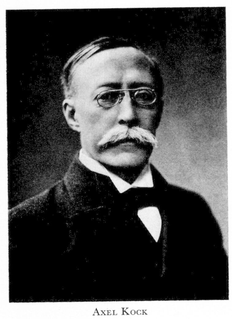 2 Kock, Karl Axel Lichnowsky, brorson till K 1, f 2 mars 1851 i Trelleborg, d 18 mars 1935 i Lund. Föräldrar: köpmannen Johan (John) Engelbrekt K o Jeannette Ingeborg Bruzelius. Studentex vid Lunds katedralskola 27 maj 70, inskr vid LU 12 sept 70, FK där 15 sept 75, inskr vid Strassburgs univ 10 maj 76, FL vid LU 31 jan 79, disp 8 febr 79, doc i nordiska språk 5 mars 79, FD 31 maj 79, allt vid LU, led av styr för Kulturhist fören för s Sverige 82—88, sekr i Filolog sällsk i Lund 82—91, huvudred för Arkiv för nordisk filologi 88—28, prof i nordiska språk vid GH 28 nov 90—31 aug 93, rektor där 3 jan—13 juli 91, prorektor där 13 juli 91—31 aug 93, vetensk arbete som privatman i Lund 93—07, ordf i Filolog fören i Lund 00—13, i Etnolog fören 03—okt 12, ordf i styr för privata h lärarinnesem i Lund 05—okt 12, prof i nordiska språk vid LU 26 april 07—7 april 16, rektor där 15 mars 11—7 april 16, ordf i Skånska landsmålsfören 16—25, i Sydsv ortnamnssällsk 25—26. — SA:s mindre skådepenning 87, LVVS 90, SA:s k pris 92, LFS 06, LVHAA 06, LSkS 07, LVA 13, LHVL 18, HedLVSL 24, LSA 24.