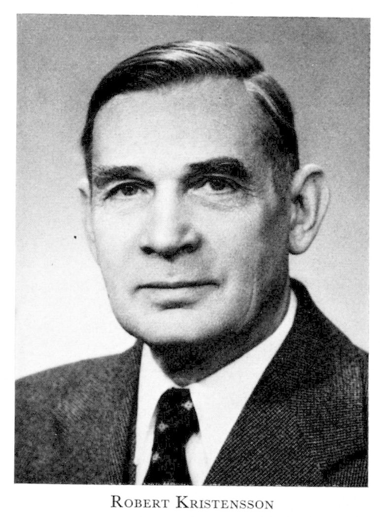 Kristensson, Robert Emanuel, f 25 maj 1896 i Osby, Krist, d 14 febr 1975 i Sthlm, Engelbr. Föräldrar: köpmannen Adolf K o Emilia Elisabeth Eliasson. Studentex som privatist i Lund 24 aug 15, elev vid KTH ht 15, avgångsex från dess fackavd för maskinbyggn:konst o mek teknologi 31 maj 19, utex från Sthlms handelshögsk 14 jan 19, ekonomichef vid Norsk kulelager A/S Oslo, 1 juli 20—1 febr 21, offertingenjör vid Sv kullagerfabriken 15 aug 21—1 mars 22, e lektor vid Tekn gymn, Örebro, 22—24, speciallär i bokföring vid KTH 1 jan 24—30 juni 31, ekon studier vid StH ht 24—vt 26, speciallär i fabriksorganisation vid Sthlms handelshögsk 24—25, tekn chef i ab Engströms rullkort 1 okt 25—1 nov 26, VD för ab Fribergs högvacuumpump, Sthlm, 1 aug 27—15 juni 30, lär i industriell ekonomi o organisation vid art- o ing:högsk 29, dir:ass o expert i industriell ekonomi vid ab Swedish Invention Corporation 31—33, dir i Sv patentab 33—35, doc i bedriftsökonomi vid Norges handelshögsk, Bergen, 1 okt 35—37, prof där 1 dec 37—13 dec 40, sekr i Sveriges mekaniska verkstäders förtr.s komm för enhetliga redovisnmetoder 41—43, ledare för Sv lantarbetsgivarefören:s arbetsstudier aug 42—45, prof i industriell ekonomi o organisation vid KTH 31 juli 45—66 (pension 62), ordf i Skoindustrins forskdnst 47—57, led av styr för Inter-University Contact i Delft 51—61. — LLA 45, LIVA 50.