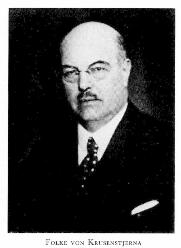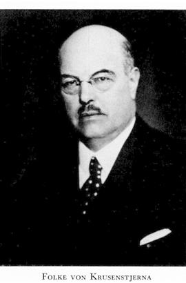 6 von Krusenstjerna, Johan Gustaf Folke, f 11 aug 1872 på Vartorp, Söraby, Kron, d 9 juli 1966 i Sthlm, Hovf. Föräldrar: majoren Oscar Mauritz Zakarias v K o Emilie Fredrika Sofia Aschan. Mogenhetsex vid h a l i Växjö vt 91, inskr vid LU 18 sept 91, jur fil ex 12 nov 92, jur utr ex 23 sept 98, eo notarie i skånska hovrätten 29 sept 99 o i Svea hovrätt 01, amanuens i civ:dep 21 jan 01, tf notarie i riksförsäkr:anst 23 nov 02–11, sekr hos Sthlms handels- o sjöfartsnämnd 06–11, chef för Sthlms fondbörs dec 05–11, kassadir i Sthlms ensk bank 25 aug 11–13, bankinsp o chef för bank- o fondinsp 12 dec 13–37, ordf i banklagskomm juli 15–juni 16, led av komm rör lag om försäkr:rörelse maj 16–febr 17, ordf i komm rör fondbörshandel juni 16–mars 18, v ordf i bankkomm sept 17–okt 19, led av finansrådet 17, ordf i sparbankskomm jan 20–juli 21, led av försäkninsp 31 dec 21, av komm rör bankrörelse aug 24–juni 27, särsk led av riksförsäkr:anst 25–43, fullm för folkpensionsförsäknfonden 31–43, led av komm rör bankrörelse april–dec 32, led av komm rör Sveriges stadshypotekskassa 12 okt 33–12 april 34, av Riddarhusdir 35–41, ordf i sällsk Pro patria 35–45, jourhavande dir i Försäkr:ab Skandia 37–44, ordf i styr för Inteckn:banken ab 41–49, chef för hovförvaltn 41–51.