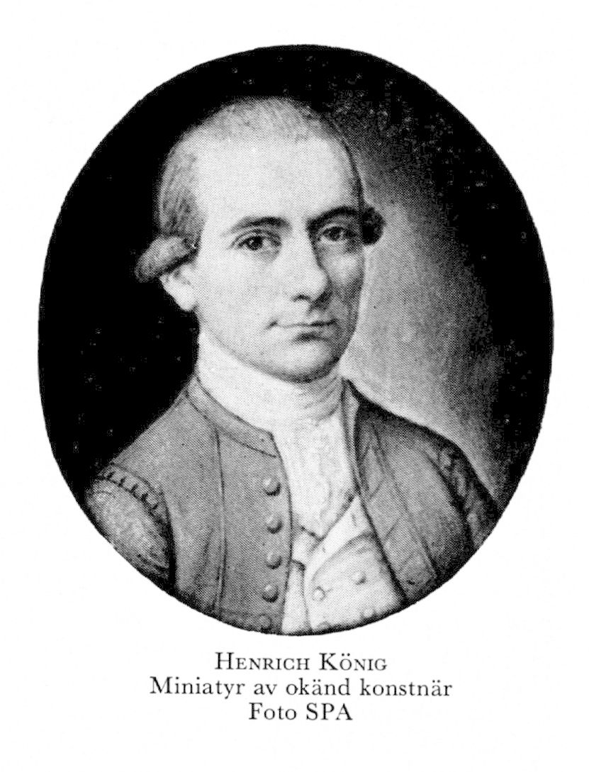 1 König, Henrich, dp 6 mars 1717 i Sthlm, Ty, d 6 okt 1785 i Eftra, Hall. Föräldrar: köpmannen Henrich K och Petronella Schaeij. Superkarg på Ostindiska kompaniets fartyg Götheborg jan 39—15 juni 40, på Calmar 14 mars 41—25 aug 43, på Stockholm jan 45, Hoppet 26 jan 48—11 juli 49, deltog i riksdagarna 51—52 o 55—56, huvudman för det fjärde s k K:ska växelkontoret 29 nov 56, handelsagent i Hamburg 14 juni 63—68, superkarg på Terra Nova 19 jan 75—9 juni 76.