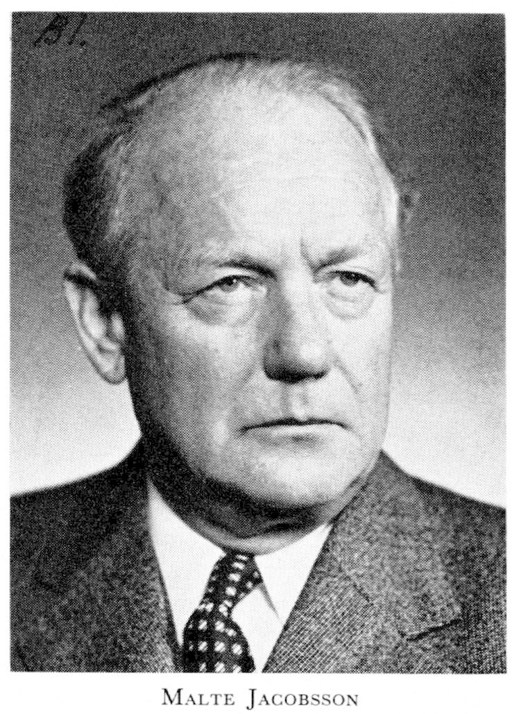 Jacobsson, Malte Ferdinand, f 3 april 1885 i Kristianstad, d 22 dec 1966 i Gbg, Vasa. Föräldrar: hovrättsvaktmästaren Nils J o Anna Persson. Mogenhetsex vid h a l i Kristianstad 13 juni 03, inskr vid LU 12 sept 03, FK 31 jan 06, FL 14 sept 08, disp 28 maj 10, FD vid LU 31 maj 10, docent i teoretisk filosofi där 17 okt 10, tf lär i praktisk filosofi o pedagogik vid GH ht 12—vt 14, lär i psykologi o pedagogik vid Kjellbergska h lärarinnesem 12—26, tf prof i filosofi o pedagogik vid GH 18 maj 14— 30 juni 19, tf prof i filosofi 1 sept 19, stadsfullm i Gbg 19—34 (ordf 27—34), prof i filosofi 19 mars 20—16 dec 34, led av drätselkammarens första avd 23—32, av Gbgs arbetarinst 23—31, av styr för Gbgs sjöfartsmus 24—33, v ordf i Sv stadsförb:s finansråd 28—37, ordf i polisnämnden i Gbg 28—34 o stadskollegiet 32—34, landsh i Gbgs o Bohus län 29 okt 34—50, ordf i styr för Chalmers tekn högsk 34—39, för Handelshögsk i Gbg 34—50, för Gbgs o Bohus läns hushålln:sällsk från 34, för Sv skeppshypotekskassan 35—57 o för Gbgs mus 35—56 (led där från 23), i komm för utredn av statligt brännoljemonopol 13 dec 35—9 nov 36, i styr för GH 35—50, för Brand- o livförsäkringsab Svea 36—54 o för Rederiab Transatlantic 36—39, i komm rör befrämjandet av avsättn för den sv stenindustrins produkter 5 mars 37—22 mars 39, i styr för Oceanografiska inst i Gbg 38— 50 o för Statens skeppsprovn:anstalt 40—50, i kommunindeln:komm 30 juni 43—44, i styr för Socialinst 44—58, i atomkomm 23 nov 45—58, i styr för Gbgs o Bohus läns länsarbetsnämnd 46—50, för ab Atomenergi 47—56 o för Sv vägfören 47—57. — LWS 27, LLA 47, med hedersdr vid Gbgs högsk 10 okt 53.