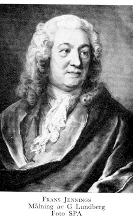 1 Jennings, Frans, f 1692 i Belfast, Irland, d 19 juli 1754 på Skånellaholm, Skånela, Sth. Järnexportör i Sthlm från 1720-talet, naturaliserad sv adelsman 21 juli 42, deltog i riksdagarna 42—43 o 51—52, kommerseråds titel 8 juli 51, bruksägare.