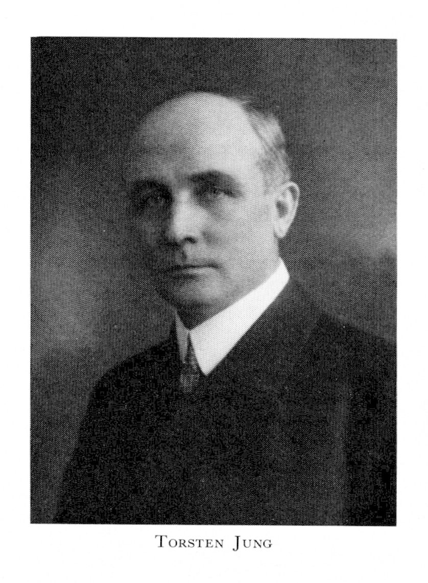 Jung, Karl Torsten Fredrik, f 28 maj 1880 i Malmö, Caroli, d 29 maj 1961 i Vireda, Jönk. Föräldrar: rektorn Victor Pontus J o Maria Emilia Levan. Mogenhetsex vid h a l i Helsingborg vt 97, elev vid KTH (maskinbyggn:konst o mek teknologi) 18 okt 99—10 juni 01, anställd vid patent- o registreringsverket 9 nov 01—31 dec 14 (eo tjänsteman 01—06, bitr ing 1 okt 06—14, tf byråing 09—14), konstruktör vid ab Diesels motorers ritkontor, Sickla, Sth, 1 febr 02—1 febr 03, assistent o förste assistent vid KTH 03—13, lär i matematik vid Tekn skolan i Sthlm läsåren 03—05 o 06—08, studieresa till USA 05—06, överlär i mekanik o maskinlära vid Tekn skolan läsåren 08—13, tf lektor i konstruktion av enkla maskindelar vid KTH 1 nov 07—08, tf prof i mekanik o maskinlära där 19 dec 11 (tilltr 1 jan 12)—1 juli 12, övering vid ab Förenade sv tändsticksfabriker 13—33, vice VD där 17— 33, VD o led av styr där 33—49, led av styr för Sv ab Logg, Sthlm, 6 febr 14—25, VD där 16—17, VD o led av styr för ab Siefvert & Fornander, Kalmar, 14—21, led av stadsfullm o drätselkammaren där 17—21, ordf i styr för Maskinfabriksab Norrbacken, Blomstermåla, Kalm, led av styr för Smålands o Blekinge handelskammare, Jönköping, 18— 53, ordf där 37—53, led av styr o tekn dir för Sv tändsticks ab, Sthlm, 20—32, led av styr för Smålands ensk bank, Jönköping, 22—32, ordf i styr för Anneberg-Ormaryds järnvägsab, Jönköping, 29—34, VD o led av styr för Jönköpings o Vulcans tändsticksfabriksab 29—49, ordf i styr för Sv vaxduksab, Smålands Anneberg, Jönk, 36—55, för Jönköpings mek verkstads ab, Jönköping, 45— 51, för Försäkringsbol Allm brand där 46— 50 (led av styr 33—50, v ordf 42—45).