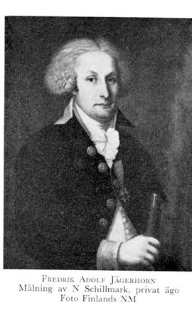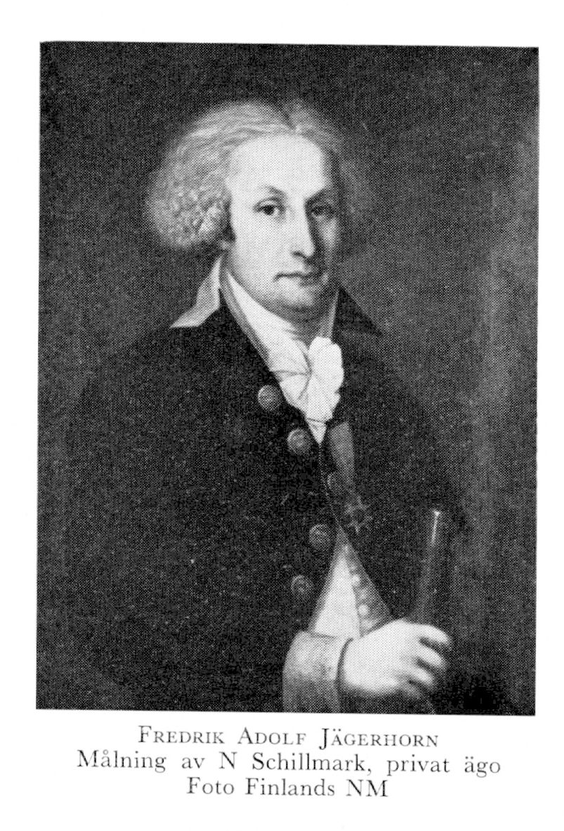 3 Jägerhorn, Fredrik Adolf, bror till J 2, f 2 maj 1760 i Helsinge, Nylands län, d 23 dec 1817 på Nykulla i Pernå, Nylands län. Volontär vid Nylands o Tavastehus läns dragonreg 67, page hos konungen 75, adj vid Savolaks lätta infanterireg 6 juni 77, fänrik vid livgardet 10 dec 77, löjtn o adj där 17 april 83, kapten 26 dec 90, major 19 april 95, överste i armén 16 nov 99, överste för det sk J:ska reg i Finland 19 febr 01, i rysk fångenskap 08, i rysk tjänst 08, landsh i Kymmenegårds län 21 mars 10—5 nov 12. — Ogift.