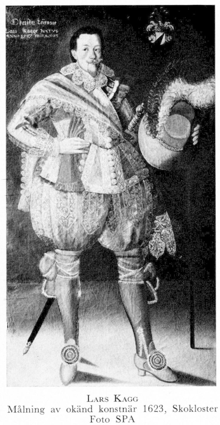 Kagg, Lars, f 1 maj 1595 på Källstorp, Örslösa, Skar, d 19 nov 1661 i Sthlm, begr 8 juni 1662 där, Ridd. Föräldrar: kammarjunkaren Nils Kagge o Brita Larsdtr (Hård). I hovtjänst hos drottn Kristina 09, deltog i fälttåget mot Ryssland 14—15, vid prins Moritz' av Oranien garde 16—19, fänrik vid ett värvat reg i kurfurste Fredrik V:s av Pfalz tjänst, fänrik vid Östgöta infanterireg 20, hovjunkare 20, kaptenlöjtn vid Östgöta infanterireg mars 21, kapten där maj 21, reg:kvartermästare där juni 21, överstelöjtn 22, generaladj för infanteriet 25, kommendant i Dirschau 26, överste för Jönköpings infanterireg 12 mars 28—33, kommendant i Magdeburg o guvernör över stiftet Magdeburg 32, överste för livgardet 32, generalmajor under hertig Georg av Lüneburg 33, kommendant i Regensburg o därinvid liggande slott o städer i Oberpfalz o Bayern 16 febr 34, generalmajor över den sv armén i Preussen o överste för Älvsborgs reg 27 april 35, krigsråd 9 mars 36, riksråd 14 april 41, generallöjtn över hela armén 43, fältmarskalk 29 febr 48, frih 16 okt 51, greve 2 okt 53, riksmarsk 20 okt 60.