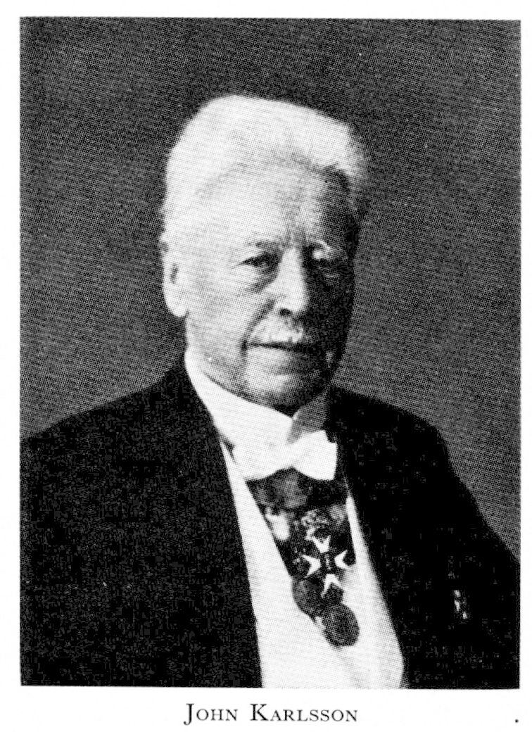 1 Karlsson, John Otto, f 31 maj 1855 på Råby, Dingtuna, Vm, d 26 juli 1929 i Västerås. Föräldrar: kronolänsmannen, godsägaren o rdgm Frans Otto K o Theodora Ulrika Berglund. Mogenhetsex i Västerås vt 74, inskr vid UU ht 74, preliminärex 29 maj 75, hovrättsex 13 sept 78, eo notarie i Svea hovrätt 24 okt 78, v häradsh 81, landskanslist i Västmanlands län 12 mars 81, länsnotarie där 24 juli 86, stadsfullm i Västerås o ordf i drätselkammaren 86—99, kronofogde i Bergslags fögderi 7 dec 88, led av styr i Asea 91—97 o 10—29, kronofogde i Västerås fögderi 26 april 95, borgmästare i Västerås aug 99, led av Västmanlands läns landsting 03—27 (ordf 11—27), led av styr i Mälarprovinsernas bank (från 22 ab Målarbanken) 03—26, av styr för ab Sv metallverken 06—29, av FK 10—11 o 24—28, ordf i styr för Hallstahammars ab 11—29 o för Sala—Gysinge—Gävle järnvägsab 18— 19. — Iqml 27.