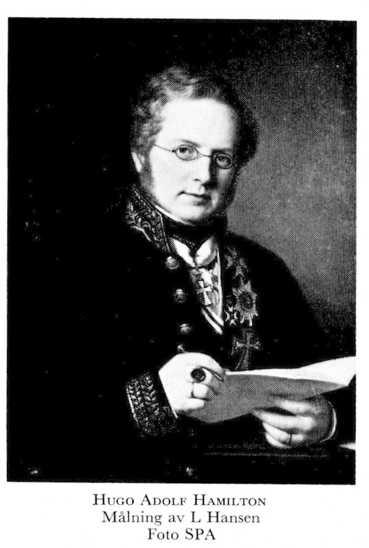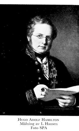 8 Hamilton, Hugo Adolf, f 2 okt 1802 på Boo, Bo (Ör), d 5 juni 1871 där. Föräldrar: landsh o överstekammarherren frih Carl Didrik H o Anna Catharina Adelheim. Inskr vid UU 6 okt 19, stor teol ex 24 nov 19, disp pro exercitio 1 dec 21, FK 23, disp pro gradu 11 juni 24, mag 12 juni 24, allt vid UU, tjänstg i kammarexp o kammarkoll 24—28, kammarherre hos kronprins Oscar 1 jan 26, deltog i riksdagarna 28—66, led av FK 67—70, andre sekr i kabinettet för utrikes brevväxlingen 24 juni 28—30 dec 34, direktör för Örebro ensk bank 37, ordf i statsrevisionen 43, förste direktör för spektaklerna 6 aug 44—4 dec 48, överpostdirektör 19 dec 45—7 aug 50, ordf i Örebro läns hushålln:sällsk 51, landstingsman från 63, ordf i reformkommittén 63. — LFrKA 40, LLA 43, HedLFrKA 48, HedL av Skaraborgs läns hushålln:sällsk 50.