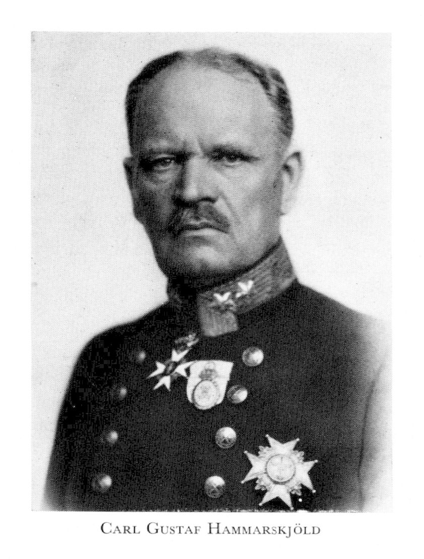 6 Hammarskjöld, Carl Gustaf Valdemar, bror till H 5, f 22 april 1865 i Tuna (Kalm), d 27 febr 1940 i Sthlm (Hedv El). Mogenhetsex i Uppsala 23 maj 83, elev vid krigsskolan 17 juli 84—5 okt 85, underlöjtn vid Värmlands fältjägarekår 30 okt 85, löjtn där 6 aug 91, aspirant i generalstaben 1 okt 92, kompaniofficer vid krigsskolan 25 sept 95, löjtn vid generalstaben 31 dec 95, lär i militärförvaltn vid krigshögskolan 31 jan 99—03, kapten i armén 7 april 99, vid generalstaben 7 juli 99, i Vaxholms grenadjärreg 1 maj 03, generalstabsofficer vid 2:a arméfördeln 1 nov 03, sekr i kommittén ang icke vapenföra värnpliktigas tjänstgöring febr—juli 05, stabschef vid l:a arméfördeln 16 maj 05, major vid generalstaben 16 febr 06, souschef i lant-försvarsdep.s kommandoex 15 okt 06, led av volontärkommissionen 07, av 07 års generalskommission sept 07—juni 08, överstelöjtn i armén 12 juni 09, vid Första livgrenadjärreg 8 mars 10, överste i armén 14 febr 13, biträdde försvarsberedn vid utarb av kostniförslag till härordn 28 nov 13—14, överste o chef för Första livgrenadjärreg 17 april 14, chef för 3:e infanteribrigaden 1 jan 17, led av AK 18—20 o av FK 25— 32, generalmajor o chef för 6:e arméfördeln 14 juli 19, led av kommittén ang försvarsrevisionen 12 nov 19—15 mars 23, statsråd o chef för försvarsdep 27 okt 20—6 juni 21, chef för generalstaben 14 juni 22, generallöjtn i armén 23 april 26, general 23 april 30. — LKrVA 07.