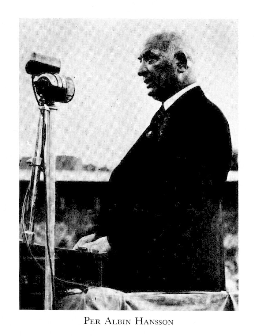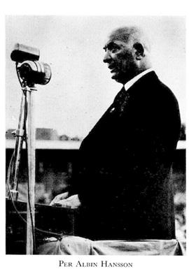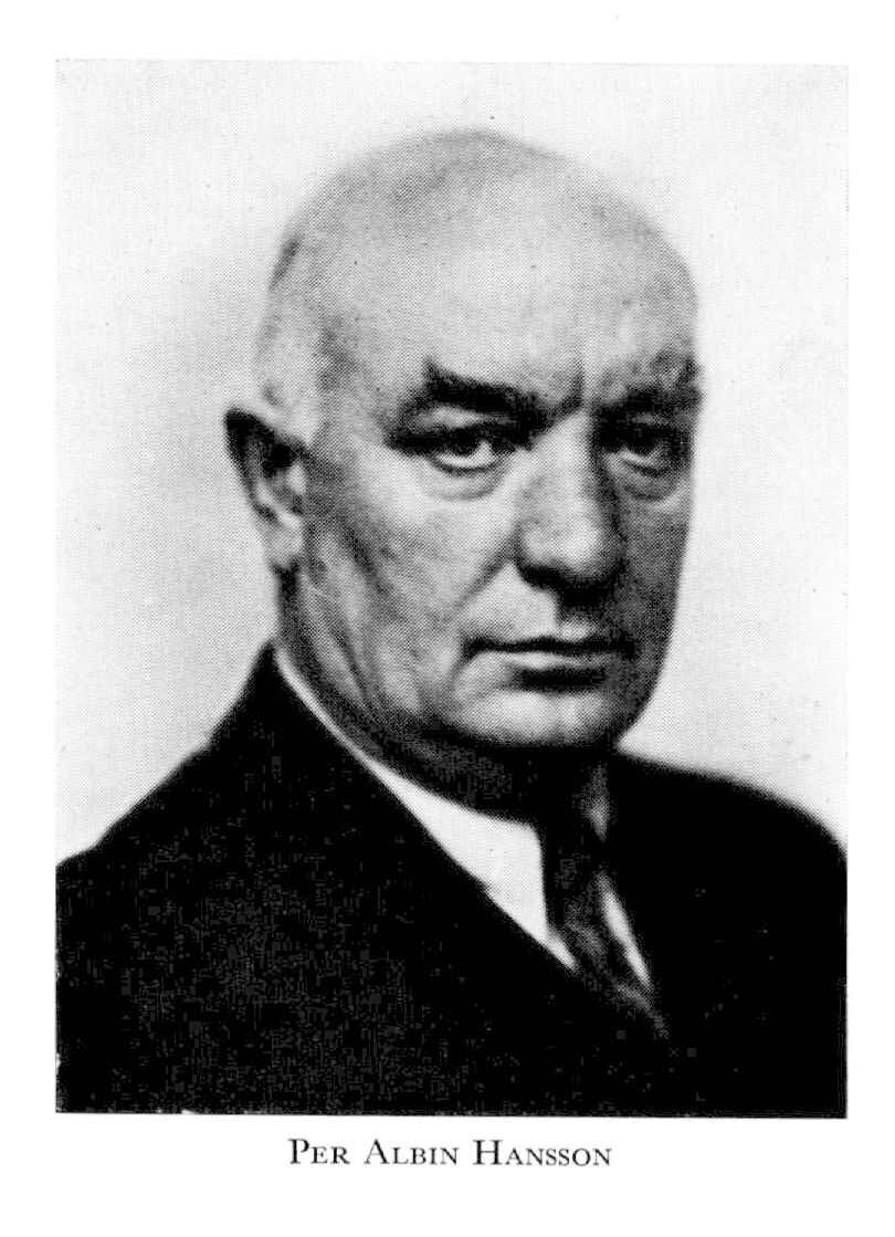 2 Hansson, Per Albin, bror till H 1, f 28 okt 1885 i Fosie (Malm), d 6 okt 1946 i Sthlm (Bromma). Springpojke i kooperativa affären Pan i Malmö 97—99, handelsbiträde där 00—04, anställd på tidn Arbetets exp 04, deltog i bildandet av Soc:dem ungdomsförb 03, förtroendeman där och red för förb:s tidskr Fram 05—09, led av soc:-dem partistyr 08, medarb i Soc-Demokraten 1 jan 10—1 maj 15, led av soc:dem partistyr verkst utsk från 11, souschef i Presscentralen nov 15—juni 16, andre red för Soc-Demokraten juli 16—okt 17, huvudred där nov 17—mars 20, led av AK från 18 (led av statsutsk 19—20, av 3:e särsk utsk 19B, av 1:a lagutsk 21, av särsk utsk 24 o 30, av talmanskonferensen o utrikesnämnden 27—32), led av 1918 års försvarskommission dec 18—nov 19, av 1919 års försvarsrevision nov 19—mars 20, statsråd o chef för Lantförsvarsdep (Försvarsdep från 1 juli 20) 10 mars—27 okt 20, 13 okt 21—19 april 23 o 18 okt 24—7 juni 26, huvudred för Soc-Demokraten nov 20—12 okt 21, med:red där maj 23—17 okt 24, soc:dem partiets partiordf från 25 (utsedd av partistyr; beslutet konfirmerades av partikongressen 28), ordf i 1925 års flottbyggn:kommit-té 26, polit medarb i Ny Tid juli 26—sept 32, led av kommittén ang den centrala försvarsförvaltn okt 26—nov 27, riksbanksfullm 29, 32 o 36, ordf i kommittén ang Sthlms flottstation juni 29—dec 30, red för Folkbladet juli 30—sept 32, ordf i 1930 års försvarskommission okt 30—sept 32 (led till juni 34), led av kommittén ang förberedande av Sveriges deltagande i 1932 års allm nedrustn:konferens juni 31—jan 32, statsminister 24 sept 32—19 juni 36 (soc:dem), 28 sept 36—dec 39 (soc:dem o bondeförb), 13 dec 39—30 juli 45 (samlingsregering) o från 31 juli 45 (soc:dem).