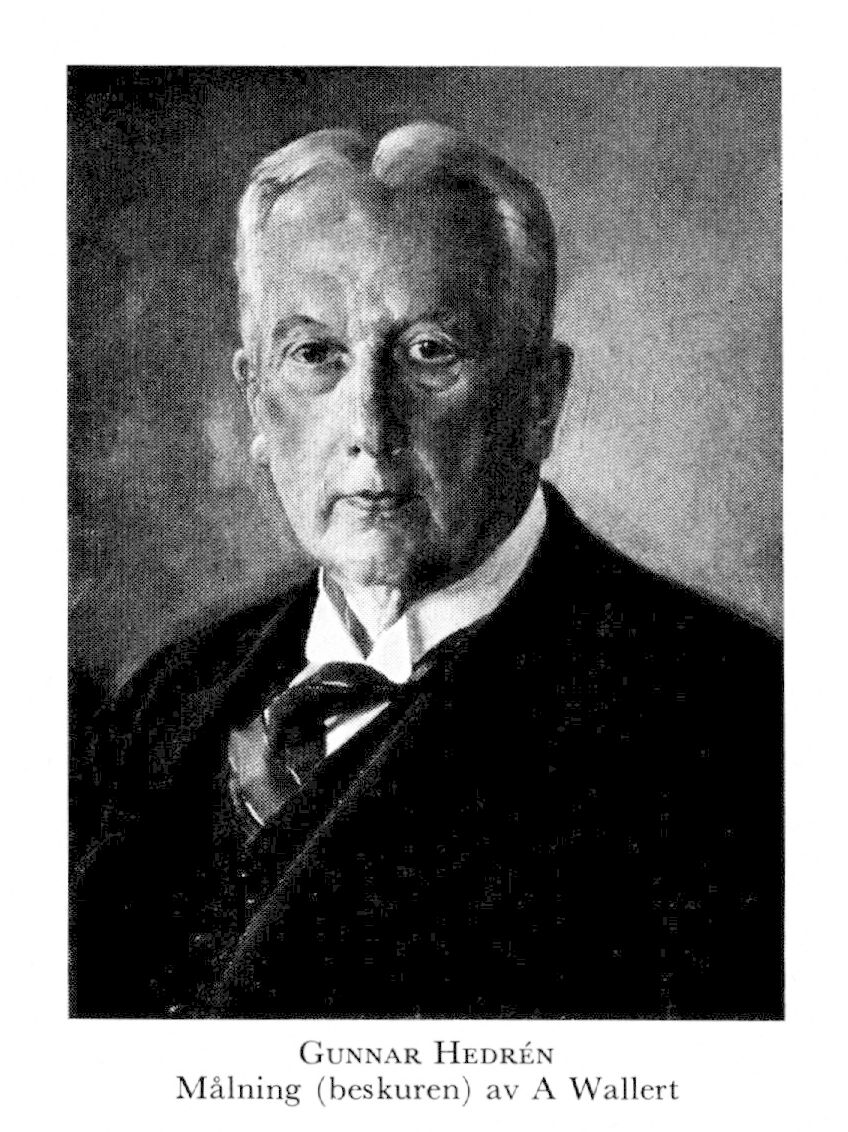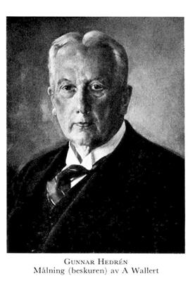 2 Hedrén, Gunnar, f 20 april 1865 i Gunnarskog (Värml), d 11 sept 1941 i Sthlm (Engelbr). Föräldrar: kh Sem H o Jakobina Lovisa (Louise) Söderström. Studier vid h a l i Karlstad 76—82, mogenhetsex vid h a l i Uppsala 9 juni 84, inskr vid UU ht 84, med fil ex där 28 jan 86, MK 30 nov 91, ML 15 dec 97, amanuens vid Akad sjuklus i Uppsala med o pediatriska poliklinik 1 jan 97, amanuens o underläk vid med avd där 1 jan 98—15 sept 99, amanuens vid Karol inst:s rättsmed institution jan 00—nov 01, disp pro gradu vid Karol inst 30 maj 01, MD vid UU 31 maj 01, docent i rätts- o statsmed vid Karol inst 22 okt 01—31 dec 06, obducent vid olika sjukhus i Sthlm maj 02—21, tf prof i patologisk anatomi vid Karol inst vårterminerna 02—10 o höstterminerna 05—07, tf laborator i patologisk anatomi vid Karol inst 1 juli 04—31 dec 05, ord laborator 1 jan 06—10 juni 10, prof i patologisk anatomi vid Karol inst 10 juni 10—25 okt 18, prof i rätts- o statsmed vid Karol inst 25 okt 18—31 aug 31, medl av Medicinalstyr:s vetensk råd 25 okt 18, v ordf i Nobelkomm 21—26, ordf från 27, rektor vid Karol inst 30 april 27—31 aug 31, ordf för utredn rör det akademiska befordringsväs okt 30—febr 33, insp vid Tandläkarinst 32—41.