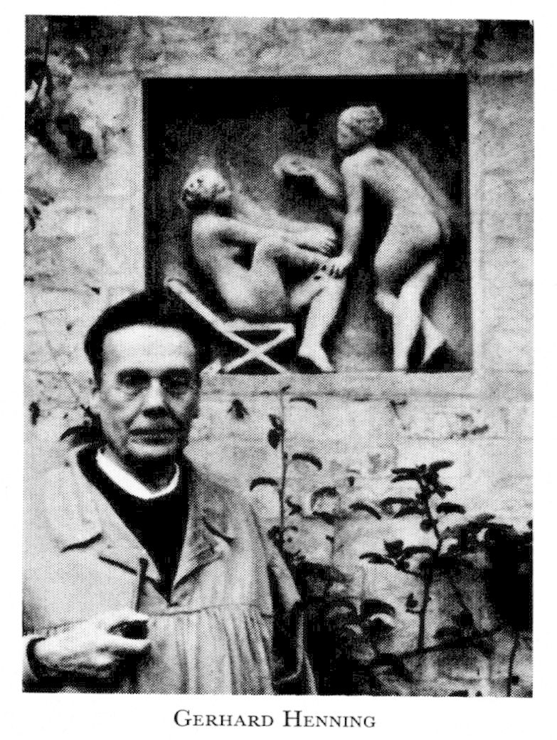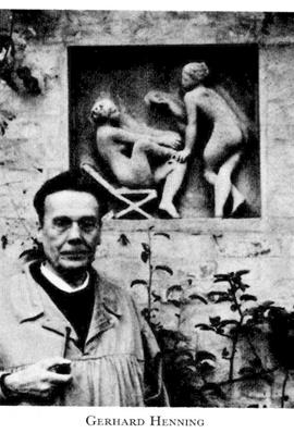Henning, Gerhard Henning, f 27 maj 1880 i Sthlm (Kungsh), d 16 sept 1967 i Hellerup. Foraeldre: skrædder August Henning Nilsson og Alma Sophia Göthberg. Elev ved Teknisk Skole i Kbhvn 92—94, malerlærling der 94, i Helsingborg 95 og i Gbg 96—98, elev ved Slöjdföreningens skola (aftenkursus) i Gbg vinteren 97—98, ved Konstnärsförb:s skola i Sthlm 99, elev ved Valand i Gbg 00—02, studieophold i Italien og Paris 03—04, billedhugger ved den Kgl Porcelænsfabrik i Kbhvn 09—14 og 20—25. — Billedhugger, tegner, maler og grafiker. — LFrKA 36.