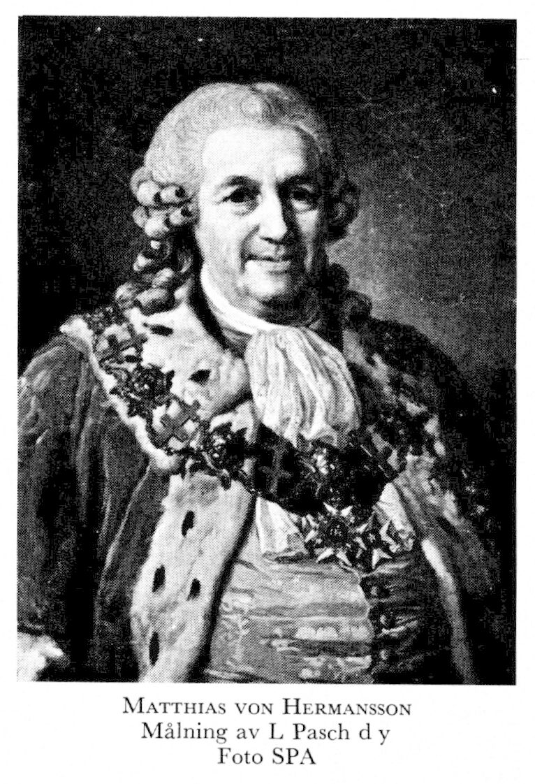 1 von Hermansson, Matthias, f 13 maj 1716 i Lund, d 25 juli 1789 i Sthlm (Jak). Föräldrar: prof Johan H o Margaretha Steuch. Inskr vid UU 12 dec 21, eo kanslist vid kanslikoll 13 juli 34, tillstånd att följa envoyén E M v No leken till Petersburg o tjänstg vid sv beskickn där 4 aug 38, sekr hos v Nolcken vid dennes fredssonderingar 42, 3:e ord kanslist vid kanslikoll 6 nov 42, sekr vid fredskongr i Åbo 18 nov 42, adl 4 jan 44, kommissionssekr vid ambassaden till Ryssland 22 mars 44, sekr vid kanslikoll 16 juni 47, eo kansliråd 20 dec 53, red för riksdagstidn 56, ord kansliråd 11 mars 57, led av ekonomi- o handelskommissionen o av 1757 års statskommission 57, statssekr för utrikes ärenden 11 sept 59, led av beredn för fred med Preussen 62, frih 10 dec 62, president i kammarrevisionen 8 nov 65, i kammarkoll 14 april 67—69, riksråd 27 maj 69, greve 15 okt 71, avsatt från rådsämbetet 4 maj 72, återinsatt i riksrådet 22 aug 72, åter president i kammarkoll 19 dec 77, avsked från sina ämbeten 16 maj 89. — RKMO 72, LSA 5 april 86.