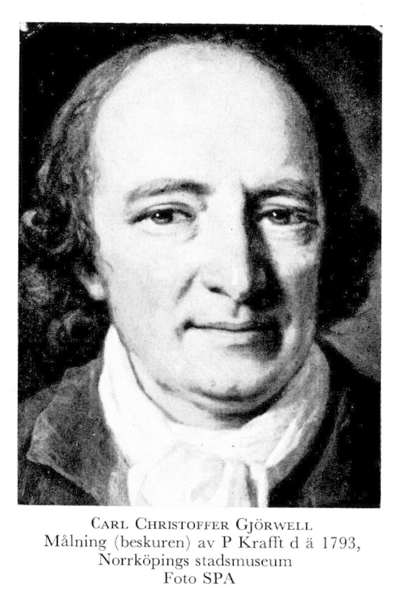 1 Gjörwell, Carl Christoffer, f 10 febr 1731 i Landskrona, d 26 aug 1811 i Sthlm (Jak). Son utom äktenskapet till överstelöjtnanten Christoffer Ehrensparre (bd 12) o Walborg Gröning, sedan g Ståhl. Inskr vid LU 44, vid Greifswalds univ 26 juli 45, var respondent i Lund 22 dec 48, informator för brukspatron Elias Brandels barn i Sthlm 51–55, extra kanslist vid (Antikvitetsarkivet o) KB 11 mars 55, amanuens där 21 nov 58, bibliotekaries namn o heder 6 mars 64, tjänstefrihet 13 aug 81, avsked 25 juni 95, förestod Gustav III:s handbibl 1772–78. Bokhandel i Sthlm från 9 jan 69. Publicist. – LVVS 1777, LFS 80.