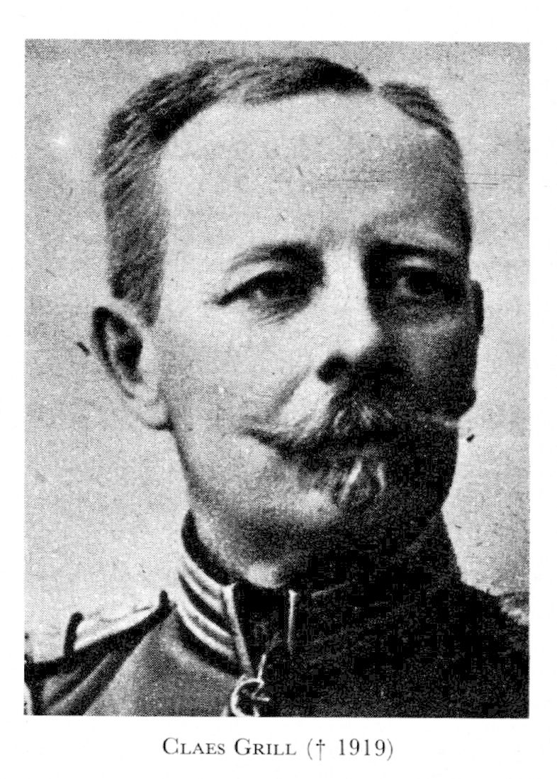 8 Grill, Claes Eric, f 18 febr 1851 i Sala, d 5 mars 1919 i Sthlm (Engelbr). Föräldrar: provinsialläkaren Claes Anton Oscar G o Erika Gustava Ödmann. Inskr vid UU ht 71, underlöjtn vid fortifik 9 sept 73, löjtn där 16 maj 79, kapten där 10 mars 93, lärare i krigsbyggnadskonst vid krigsskolan 1 nov 93—96, tjänstgöring i ryska armén 9 mån 97, fortifik:befälhavare i Gbg 31 juli 99 (97)—04, major i fortifik 2 april 02, kommendant på Älvsborgs fästning 04—07, överstelöjtn 8 febr 07, avd:chef vid fästningens byggnadsavd på fortifik:dep 1 jan 08, överstes avsked 23 april 09. Entomolog. — LKrVA 09.