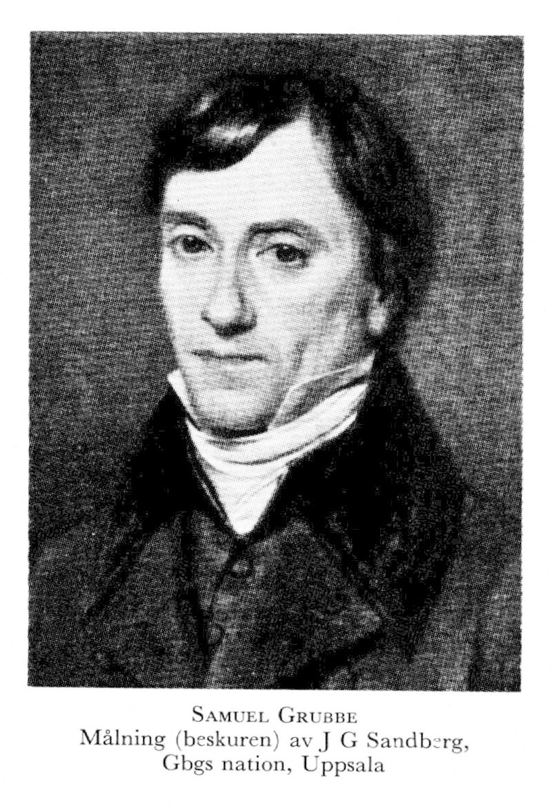 2 Grubbe, Samuel, f 19 febr 1786 i Seglora (Älvsb), d 6 nov 1853 i Uppsala. Föräldrar: majoren Carl Christopher G o Ulrica Schutz. Inskr vid UU 1 okt 02, FK 11 dec 05, mag 14 juni 06, doc i teor filosofi 18 dec 06, prof i logik o metafysik 10 mars 13, rektor vid UU vt 21 o ht 28, led av 25—28 års univ:kommitté, prof i etik o politik 26 sept 27—41, univ:s repr vid urt riksdagen 34—35, konsultativt statsråd 10 sept 40—18 maj 44, tf chef för ED 10 sept 40— 29 dec 42. — LVVS 09, LVHAA 29, LSA 30, LVA 37, HedLVHAA 53.