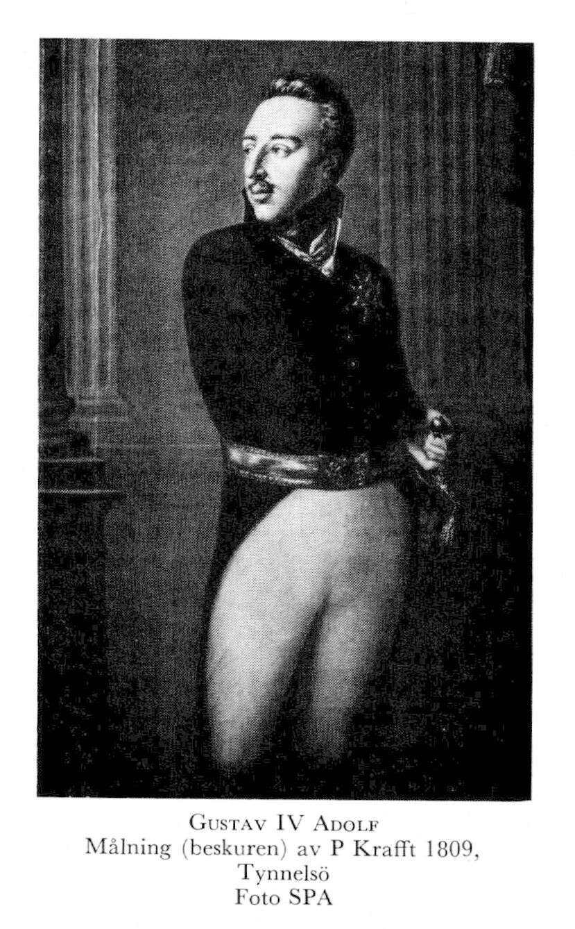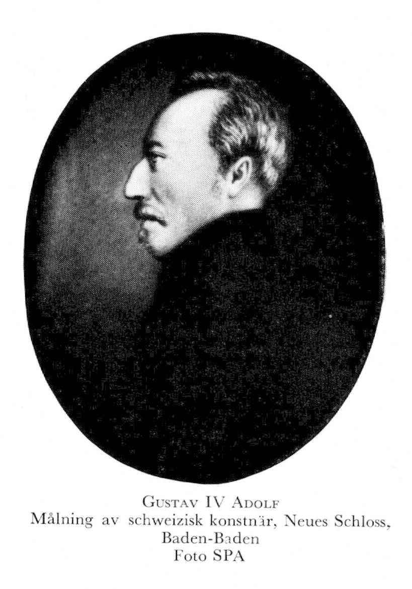 Gustav IV Adolf, f 1 nov 1778 på Sthlms slott, d 7 febr 1837 i S:t Gallen, Schweiz. Föräldrar: konung Gustav III o Sofia Magdalena av Danmark. Konung av Sverige o hertig av Pommern 29 mars 92, övertog regeringen som myndig konung 1 nov 96, krönt i Norrköping 3 april 00, arresterad 13 mars 09, avsade sig kronan 29 mars 09, avsatt av rikets ständer 10 maj 09, i landsflykt från dec 09, borgare i Basel 4 febr 18—17 jan 26, ägde hus därst 18—24. Kallade sig greve av Gottorp (Gottorff) 09—13, hertig av Holstein-Eutin 13—16, därefter överste G A Gustafsson.