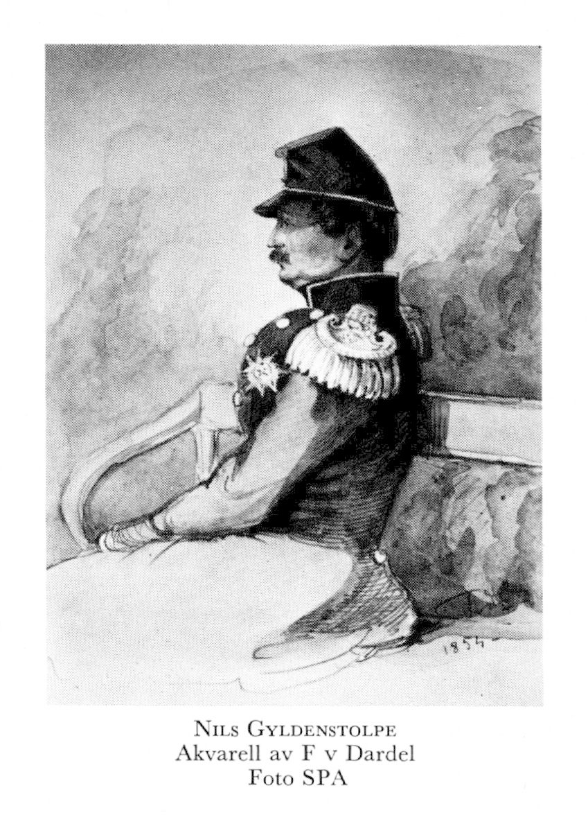 5 Gyldenstolpe, Adolph Fredrik Nils, son till G 4, f 28 jan 1799 i Sthlm (Hovf), d 26 maj 1864 där (Jak). Inskr vid UU 2 febr 16, stor teol ex 28 nov 16, matem ex 17 febr 17, korpral utan lön vid livreg:s husarkår 8 nov 17, kansliex vid UU 8 dec 17, kornett utan lön vid livreg:s husarkår 9 dec 17, eo kanslist i kanslistyr 15 jan 18, officersex 2 maj 18, kornett vid Livg till häst 19 febr 22, löjtn 12 mars 22, kammarherre hos drottn Desideria 13 juni 23, ryttmäst i reg 1 nov 26, stabsryttmäst 21 april 28, hovstallmäst hos drottn 3 juli 34, överkammarherre där 8 nov 35, major i armén 28 nov 35, i reg 11 okt 36, överstelöjtn i armén 26 jan 39, led av dir över allm inst för dövstumma o blinda 4 april 40 (ordf 42), ceremonimäst vid KMO 29 okt 40—25 juni 53, överste i armén 4 juli 43, sekundchef för Svea livg 16 mars 49—29 sept 53, ordf i dir för allm garnisonsjukh i Sthlm 9 dec 51—20 juni 53, generalmajor i armén 29 april 53, statsråd o chef för lantförsvarsdep 11 juni 53—24 sept 58, led av dir över militärhospitals- o medaljfonden 11 jan 54 (ordf 27 febr 56), generallöjtn i armén o generalbefälhavare i 2:a militärdistr 24 sept 58, tf ordf i krigshovrätten 19 okt 58—9 febr 64, ordf i bankofullm 60, riksmarskalk o en av rikets herrar 16 april 60, avsked från generalbefälhavareämb med tillstånd att kvarstå som generallöjtn i armén 8 mars 64. — LKrVA 44, HedLFr-KA 56, RoKKMO 60.