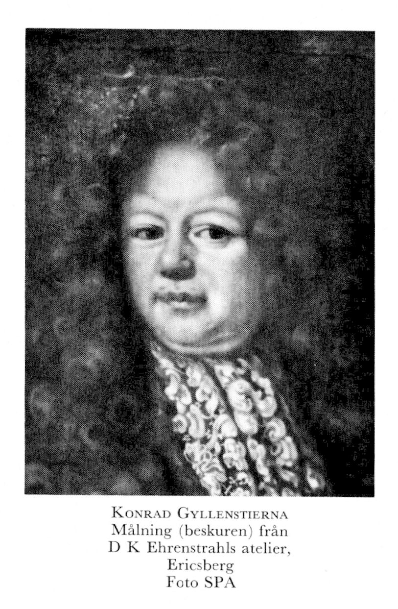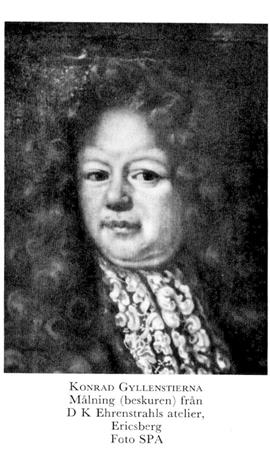6 Gyllenstierna, Konrad, f 25 mars 1638 på Viborgs slott, d 11 sept 1684 i Sthlm (begr 25 mars 85 i Ridd). Föräldrar: presidenten frih Erik G o Beata v Yxkull. Inskr vid UU 24 maj 53, assessor i kommerskoll 15 mars 65, landshövd i Viborgs o Nyslotts län 18 maj 67, landsh i Kalmar län 9 sept 74, entledigad med bibehållen lön 29 aug 77, tilldelad exspektanstjänst som häradsh i Finland 6 jan 78, av K M:t utsedd ordf i 1680 års minorennitetskommission (Stora kommissionen över förmyndarnas förvaltn) 23 nov 80, ledare för en sv beskickn till Moskva (K M:ts pass o instr 6 o 7 jan 84).