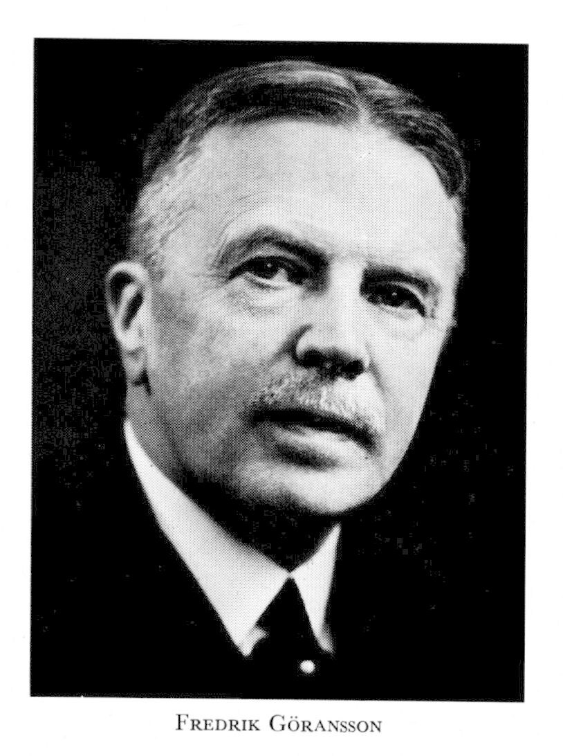 4 Göransson, Karl Anders Fredrik, bror till G 3, f 12 juni 1879 i Högbo (nu Sandviken), d 13 juni 1960 där. Mogenhetsex vid Gävle h a l 97, elev vid École d'ingenieurs i Lausanne 97—98, merkantil praktik i Tyskland o England 98—00, studier vid Columbia univ i New York 00—01, master of arts där 01, anställd vid Sandvikens jernverks ab 01, verkst dir o disp där 20—48, styr:ordf där 29—59, eo fullm i Jernkontoret 28, fullm 30, v ordf för handelskammaren i Gävle 34, styr:led i Industriförb från 34, ordf där 39— 42. — LIVA 32, Iqml 37, LVS 40, Jernkontorets stora GM 42, fil hedersdr i Uppsala 31 maj 52.