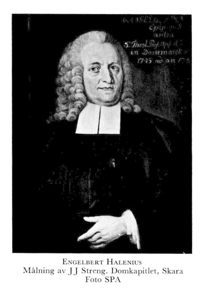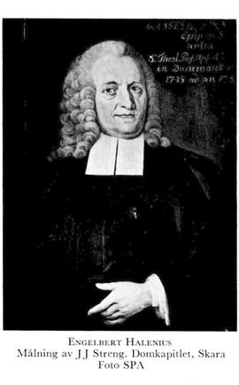Halenius, Engelbert, f 8 okt 1700 i Söderala (Gävleb), d 14 febr 1767 på Brunsbo biskopsgård, Skånings-Åsaka, begr i Värnhem (Skar). Föräldrar: kontraktsprosten Laurentius (Lars) Jonas H o Catharina Kram. Gymnasist i Gävle 16, inskr vid UU 24 april 19, mag där 4 maj 28, doc där 28, konrektor i Gävle 29, fil adj vid UU 31 dec 30, eo fil prof där 18 maj 37, teol adj o kh i Börje prebende 7 okt 41—45, v kontraktsprost i Ulleråkers kontrakt (Upps) 42, fjärde teol prof o kh i Danmarks prebende 2 okt 45—54, ord kontraktsprost i Ulleråkers kontrakt 46, tredje teol prof 47, rector magnificus 50, led av prästeståndet 51—62 (led av SU 51, 56 o 60), teol dr 15 juni 52, biskop i Skara 2 maj 53 (tilltr 54).