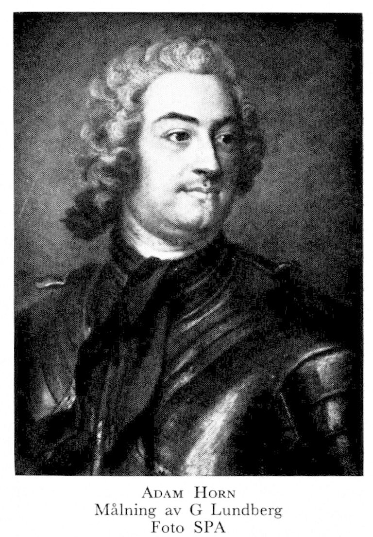 11 Horn, Adam, son till H 10 i dennes 3:e g, f 25 (dp 26) nov 1717 i Sthlm, Ridd, d 24 jan 1778 där. Volontär vid Livg till fot 21 nov 27, fänrik där 21 juni 31, kapten i hessisk tjänst 34, adjutant hos prins Georg av Hessen 35, korpral vid Livdrabantkåren 4 april 37, deltog i riksdagarna 40—60 (led av SU 51 o 60), major vid Västgöta kavallerireg 3 aug 41, generaladjutant av flygeln 16 juni 43, överstelöjtn vid Västgöta kavallerireg 17 sept 46, överste för Östgöta kavallerireg 29 okt 47, generalmajor 26 maj 57, generallöjtn 15 nov 59, riksråd 19 jan 61, överstemarskalk 10 april 61, ambassadör till danska hovet 19 aug 66, entledigad ur riksrådet 27 maj 69, chef för stuteriinrättn vid Strömsholm o Kungsör 15 mars 70, återinsatt i riksrådet 19 aug 71, chef för hovstallet 26 aug 71, entledigad ur riksrådet 22 aug 72 genom statsvälvningen men utnämnd till riksråd s d, riksstallmästare 5 okt 72. — LMA 71, HedLFrKA 76.