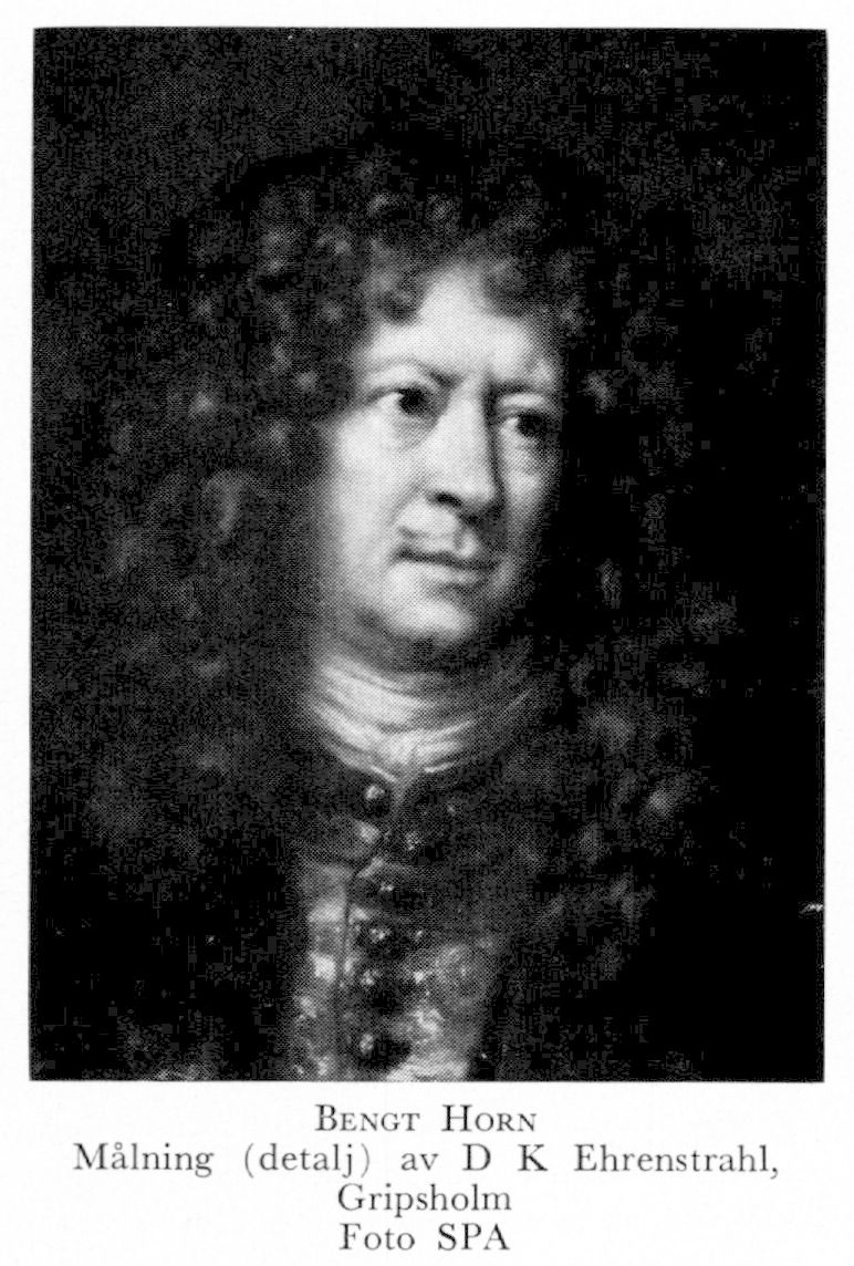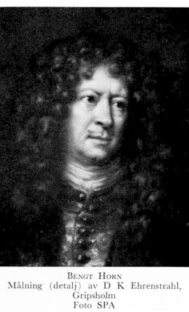8 Horn, Bengt, bror till H 7, f 10 nov 1623 på Vikhus, Rytterne, Vm, d 7 febr 1678 i Riga. Inskr vid UU 3 april 36, studier i Riga, utlandsresa, kapten vid gamla blå reg 47, major vid Gustav Otto Stenbocks reg 48, överstelöjtn där 48, kommendant på fästningarna Ottersberg o Vechta 50, guvernör över Halland 12 jan 54, överste för drottningens livreg till fot 55, guvernör över Estland juni 56, generalmajor av infanteriet 56, utsedd till förhandlare med Ryssland 22 jan 58, ledare av beskickning till Ryssland (för ratificering av stilleståndsfördraget i Vallisaari) 27 febr 59, riksråd 12 febr 60, ledare av fredsunderhandlingen i Kardis 17 mars 60 (instr 25 aug o 13 nov 60 samt 12 febr 61), ambassadledare till Ryssland för överlämnande av ratificeringsinstrumentet rör Kardisfreden 61—62, generalguvernörs titel 72, uppsikt över garnisonerna i Östersjöprovinserna 8 april 73, president i Svea hovrätt 2 juli 74, lagman i Karelen 1674—78, överbefälhavare för "livländska expeditionen" med fältmarskalks titel 3 aug 77—9 jan 78.
