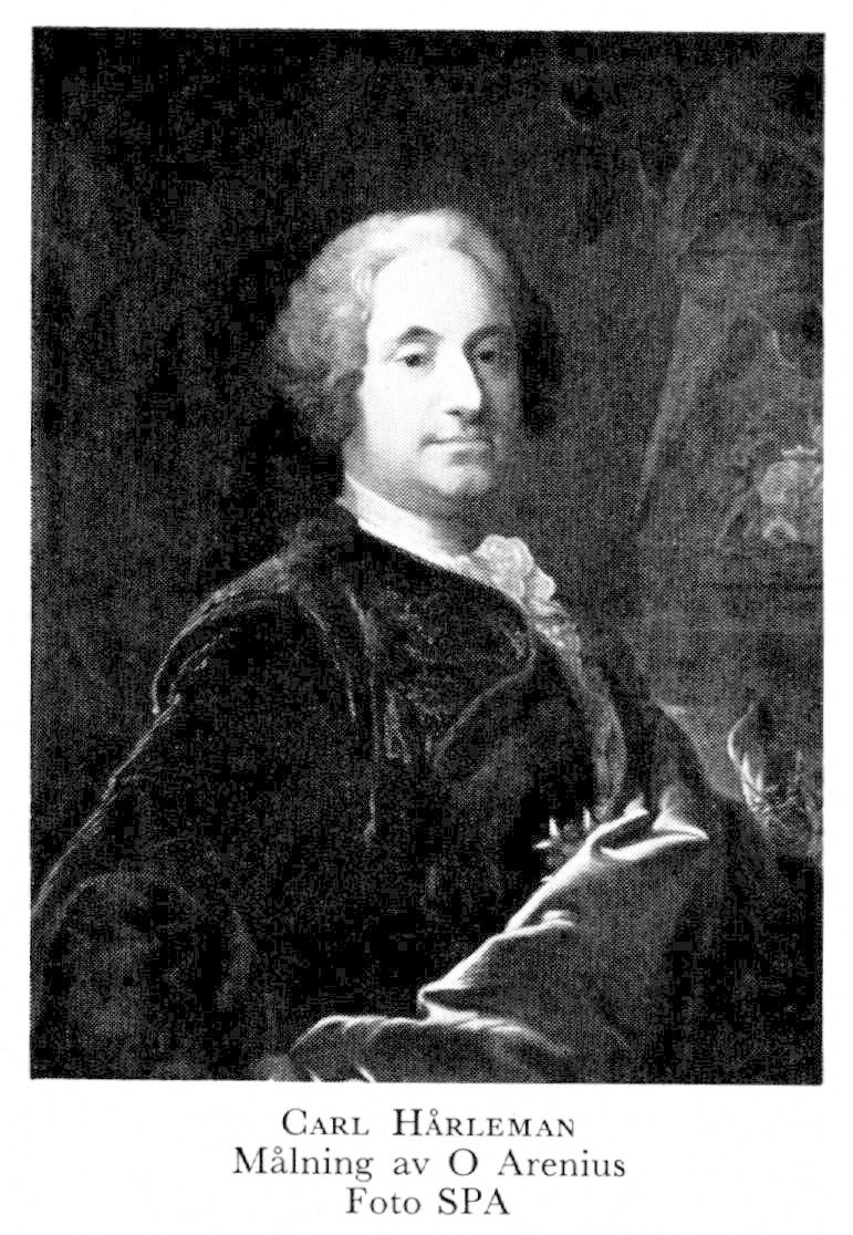 2 Hårleman, Carl, son till H 1 i dennes andra g, f 27, dp 29 aug 1700 i Sthlm, Hovf, d 9 febr 1753 där, Klara. Deltog i riksdagarna 19—20, 26—51 (led av SU 38, 40, 46), studier vid Académie royale d'architecture o vid konstakad i Paris 21—25, hovintendent 7 april 28, överintendent över K M:ts slott o trädgårdar 4 aug 41, frih 12 dec 47, ceremonimästare vid alla K M:ts ordnar 17 april 48, riksbanksfullm från 51. — LVA 42[1].