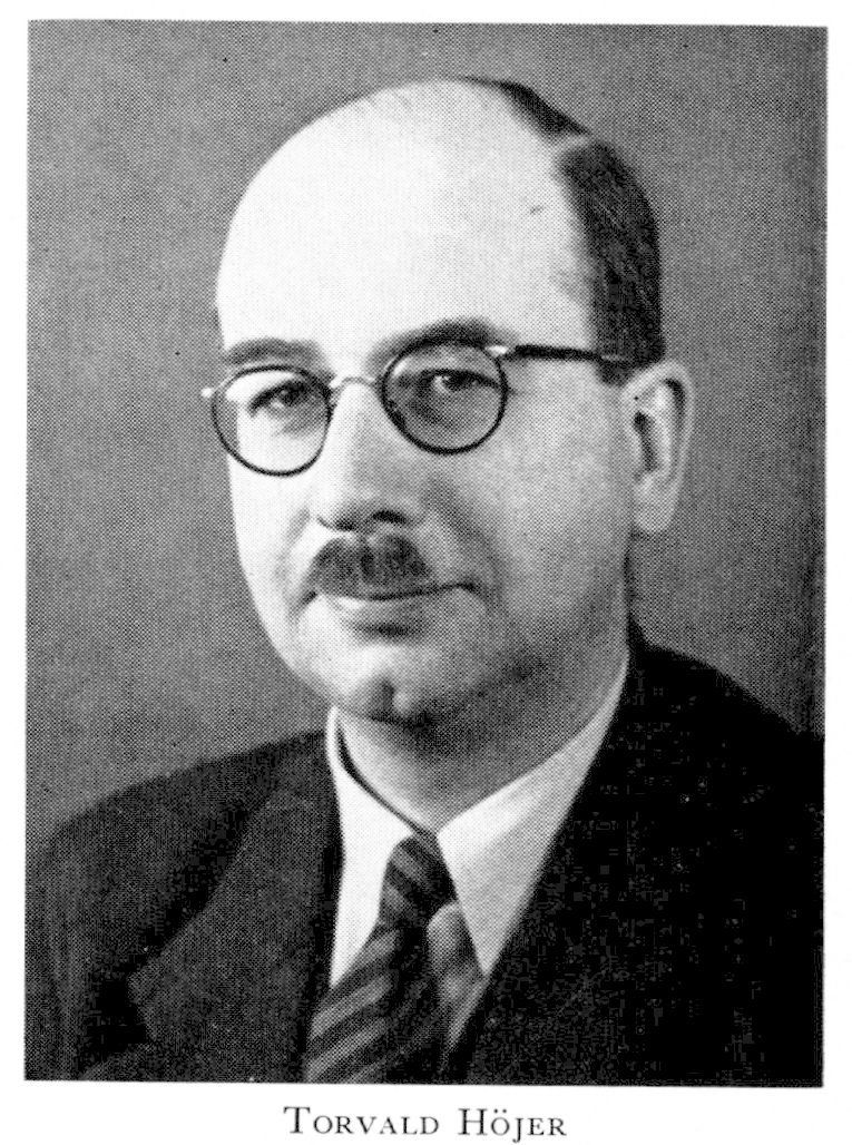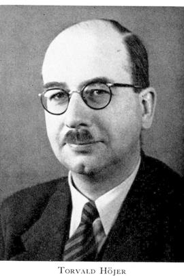 4 Höjer, Torvald Alrik Magnus, son till H 3, f 26 febr 1906 i Sthlm, Joh, d 6 jan 1962 i Danderyd, Sth. Studentex vid h a latinlärov på Norrmalm i Sthlm 10 maj 24, inskr vid UU 11 sept 25, FK 31 mars 28, timlär vid Uppsala h elementarlärov o gymn för flickor ht 32—vt 46, FL 15 sept 33, disp 7 dec 35, doc i hist 28 dec 35—50, FD 30 maj 36, allt vid UU, sekr i doc:utredn 20 sept 38—dec 39, vårdare av Bernadotteska familjearkivet 17 mars 44, lektor vid Djursholms samsk 1 juli 45—1 juli 50, led av 1945 års univ:beredn 22 juni 45—51, ordf i sv komm för internat hist samarb från 48, sekr i Sv hist fören (led av styr 44) o red för HT från 49, prof i hist vid Sthlms högsk 11 maj 50, led av styr för Samf för SBL:s utgiv från 50, red för SvT (tills m G Hafström) från 51, gästprof vid Yale univ, New Haven, Conn, USA, 52—53, ordf i Historielärarnas fören 54—60. — LSkS 44, LVHAA 55, LVA 61.