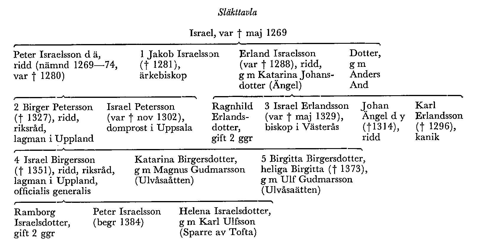 Peter Israelsson kallas dominus 1269 och var död 29 juni 1280; om hans vallfärd se ovan. Han var g m en dotter av Birger Skänkare, som torde ha fört två vingar i vapnet (Rosman). Söner till dem var upplandslagmannen, riksrådet och riddaren Birger Petersson och Israel Petersson, som blev kanik i Uppsala 1295 och år 1299 efterträdde sin kusin Andreas Andreæ (And) som domprost där. Herr Israel var död 24 nov 1302. Hans anniversarium firades i Uppsala domkyrka tillsammans med bl a kusinen Karl Erlandssons (se nedan) den 12 aug, som troligen var Israels dödsdag. Lagman Birger Petersson (d 1327; F 2) var först g m Kristina Johansdotter (Elofssönernas ätt), som levde 6 juli men var död 11 juli 1293, barnlös. Om henne se bd 13, och A F Liljeholm i PHT 1952. I sitt andra gifte med Ingeborg Bengtsdotter (Folkungaättens lagmansgren) hade herr Birger sju barn (Gardell, 1, nr 159), varav fyra tydligen tidigt döda. De kvarvarande var riksrådet, lagmannen i Uppland, riddaren Israel Birgersson (F 4) samt döttrarna Katarina Birgersdotter och Birgitta Birgersdotter, den heliga Birgitta (F 5), gifta med bröderna riddaren Magnus Gudmarsson respektive riksrådet, lagmannen i Närke, riddaren Ulf Gudmarsson (Ulvåsaätten).