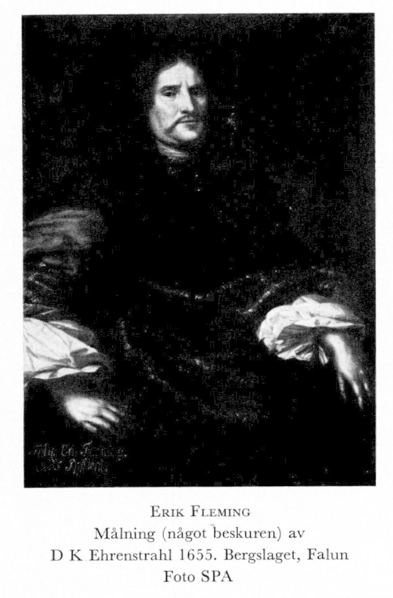 9 Fleming, Erik (Henriksson), son till F 7 i hans 1:a g, f 19 febr 1616 på Edeby gård, Salems sn (Sth; enl gravmonument i Sorunda kyrka), d 19 april 1679 på Riksten, Botkyrka sn (Sth). Medföljde 1634 som kammarh sin far på beskickningen till Moskva, assessor i generalbergsamtet 1637, studieresa till Tyskland, Holland, Belgien, England, Skottland o Frankrike 1639–42, inskr vid Leidens univ 11 aug 1640, landsh i St Kopparb län 30 april 1651, pres i bergskoll 17 mars 1652, frih till Lais 12 maj 1654, lantmarskalk 1654 o 1655, riksråd sept 1655, avsked från landsh: ämbetet s å, kommissarie i reduktionskoll 4 juli s å, avsked därifrån 1678.