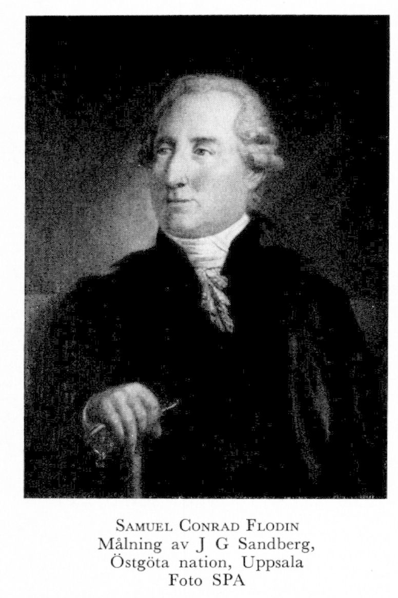 Flodin, Samuel Conrad, f 25 sept 1726 i Lommaryds sn (Ög), d 9 juni 1800 i Sthlm (Nik). Föräldrar: prosten o kyrkoherden Samuel F o Maria Agnes Quensel. Genomgick Linköpings lärov, inskr vid Lunds univ 1745, vid Uppsala univ 4 nov 1748, jur ex där s å, studier i Göttingen m fl uti universitet 1749–50, auskultant i Svea hovrätt 1753 o vid rådhus- o kämnärsrätterna i Sthlm 1756, eo notarie vid Norrmalms kämnärsrätt 4 mars 1757, 1:e brottmålsnotarie där 25 juni 1759, civilnotarie 18 dec 1761, primariekämnär 8 aug 1770, rådhusnotarie 1758, 2:e rådhusnotarie 4 dec 1767, 1:e rådhusnotarie 9 juni 1769, rådman 1 nov 1774, preses i Norrmalms östra kämnärsrätt 29 maj 1775, led av justitiekollegium 1 dec 1786, borgmästares n h o v 25 aug 1791, avsked från rådmansbefattningen 15 sept 1796 med bibehållen lön. Medlem av Uppfostringssällsk från 1786. – Ogift.