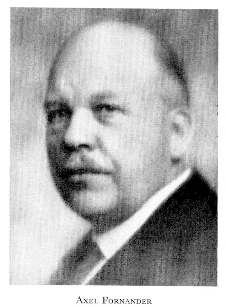 2 Fornander, Axel Magnus Erland Fabian, f 23 (ej 24) nov 1876 i Mönsterås (Kalm), d 29 juli 1944 i Sthlm (Osc). Föräldrar: grosshandl Carl Erik Fabian F o Ida Karolina Svensson. Elev vid Kalmar lärov 30 aug 1887–1 aug 1892, biträde i Kalmar ensk bank i Mönsterås 1892, bokhållare vid Mackmyra bruk 1892–94 o vid Forsbacka järnverk 1894–97, elev vid Filipstads Bergsskola 1897–98, ritare vid Forsbacka 1898, ing där 1899, studieresa till USA 1904 som kommerskoll: s stipendiat, valsverksing vid Forsbacka 1904–07, 1:e ing för verkstäderna 1907–08, övering 1908–20, studieresa till England o kontinenten 1908, disp o verkst dir vid Forsbacka 1920–24 o vid Fagersta Bruks ab 1 okt 1924–42, chef för Fagersta-koncernen från dess bildande 1927, verkst dir för Byvalla-Långshyttans järnväg 1932–43, e o fullmäktig i Jernkontoret sedan 1927, fullmäktig där 1930, ordf i fullmäktige sedan 1942, ordf i Jernkontorets tekn råd 1930–42, styr:ordf i Metallografiska Institutet, Bruksindustriföreningen, Skogens Kol-ab, Krångede ab, ab Svenskt Exporttackjärn, Brukskoncernen ab, Forsbacka Jernverks ab, Horndals Jernverks ab, Klosters ab, Österby Jernverks ab, ab Arbit, ab Dannemora gruvor o ab Holmgruvan samt led av styrelsen i flera företag. Ordf i Bergshanteringens Vänner 1929–38 o i Brukstjänstemannaföreningen 1927–33. RVO 1928, RNO 1933, KVO2kl 1937, hedersled av Verein Deutscher Eisenhüttenleute 1937, Pro Patrias stora GM 1941, KVO1kl 1942, Jernkontorets stora GM 1942, LIVA 1938, hedersled 1941. Inneh även finsk orden.