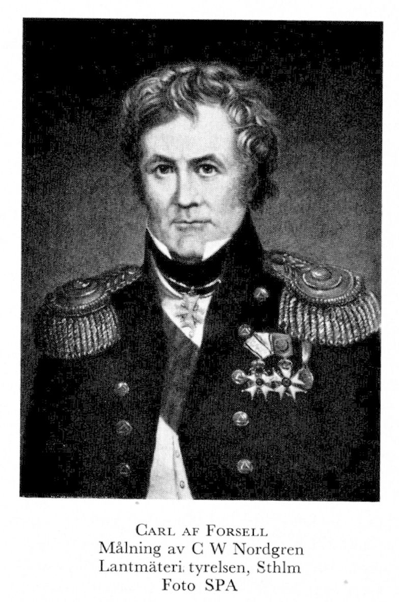 2 af Forsell, Carl Gustaf (före adl Forssell), f 18 mars 1783 på Sköttorp, Järpås sn (Skarab), d 25 okt 1848 i Sthlm (Jak). Föräldrar: kaptenen Fredric Joseph F o Maria Dorothea de Bruce. Kadett vid Karlberg 6 febr 1796–30 sept 1800, fänrik vid amiralitetet 20 (ej 27) okt 1800, underlöjtn vid fältmätningskåren 18 nov 1806, stabslöjtn där 23 dec 1808, kapten i armén 29 juni 1809, adjutant hos kronprinsen Karl August 1810, major i armén 8 maj s å, premiärlöjtn:s lön vid fältmätningskåren 22 aug s å, adjutant hos kronprinsen Karl Johan 27 febr 1811, kapten i fältmätningskåren 7 (ej 17) aug (konf 28 sept) 1813, major i kåren o överstelöjtn i armén 19 jan 1814, adl 11 febr 1817 enligt § 37 RF, överdir vid lantmäterikontoret 29 jan 1824, överste i armén 3 juni s å. GM för tapperhet i fält 1813, RSO 1814, LLA 1827, LKrVA 1843, KSO 1843. Innehade även utl ordnar.
