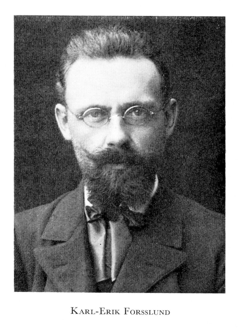 Forsslund, Karl-Erik, f 14 sept 1872 i Ljusnarsberg (Ör), d 14 aug 1941 på Storgården, Ludvika landsförs (Kopp). Föräldrar: grosshandl Carl Fredrik F o Augusta Christina Öhman. Mogenhetsex i Örebro 1889, inskr vid Uppsala univ 22 nov s å, fil lic där 29 maj 1897, fil hedersdr i Uppsala 16 sept 1927, red:sekr i Strix 1897–98, lärare vid Brunnsviks folkhögskola 1906, förest där 1907–12, styr:led vid folkhögskolan från 1906 (sekr 1907–12), styr:led i Dalarnas hembygdsförb, v ordf i Dalarnas fornminnes- o hembygdsförb 1930, ordf i Ludvikabygdens fornminnes- o hembygdsfören, styr:led i Sv naturskyddsfören 1917–27. – RNO 1932, Nord mus:s GM för hembygdsvårdande gärning 1941.