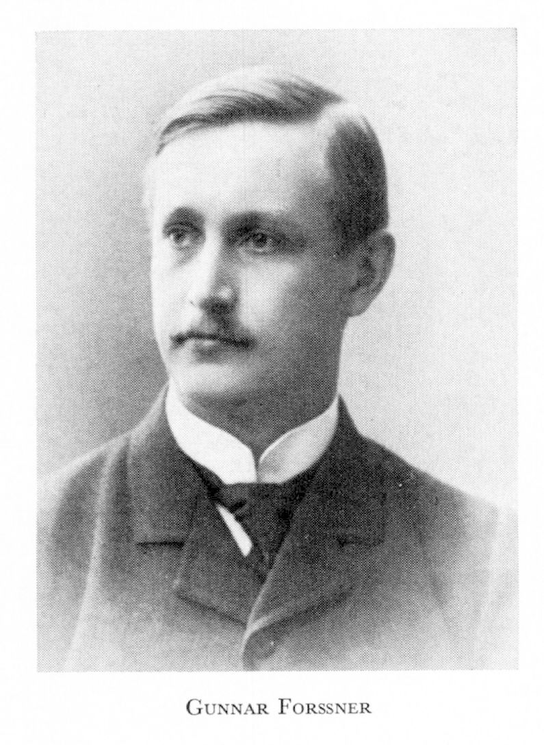 3 Forssner, Gunnar Hjalmar, bror till F 1 o F 2, f 19 maj 1876 i Sthlm (Klara), d 12 jan 1915 i Rättvik (Kopp; enl dödbok för Domk, Uppsala). Mogenhetsex vid N latinlärov i Sthlm 17 maj 1893, med fil ex vid Uppsala univ 30 maj 1894, amanuens vid Karol inst:s anatomiska institution sept 1896–sept 1898, med kand vid Karol inst 14 maj 1898, amanuens vid patol institutionen där sept 1899–sept 1901, disp vid Lunds univ 21 mars 1903, assistent vid patol institutionen i Lund april 1903–aug 1904, med lic där 14 dec 1903, doc i experimentell patologi där febr 1904–nov 1905, med dr 30 maj 1904, doc i allm patologi vid Karol inst dec 1905–nov 1909, företog 1905–09 flera studieresor till kliniker i Tyskland o England, underläk vid Serafimerlasarettets med klinik juni 1905–maj 1906, amanuens vid med polikliniken där juni–dec 1906, underläk på Kronprinsessan Lovisas vårdanstalts med avd jan–okt 1907, amanuens på Allm barnhuset okt–dec s å, klinisk laborator vid Karol inst 1 dec 1909, prof i pediatrik o praktisk medicin vid Uppsala univ 24 mars 1911, prof i praktisk medicin där 11 okt 1912.