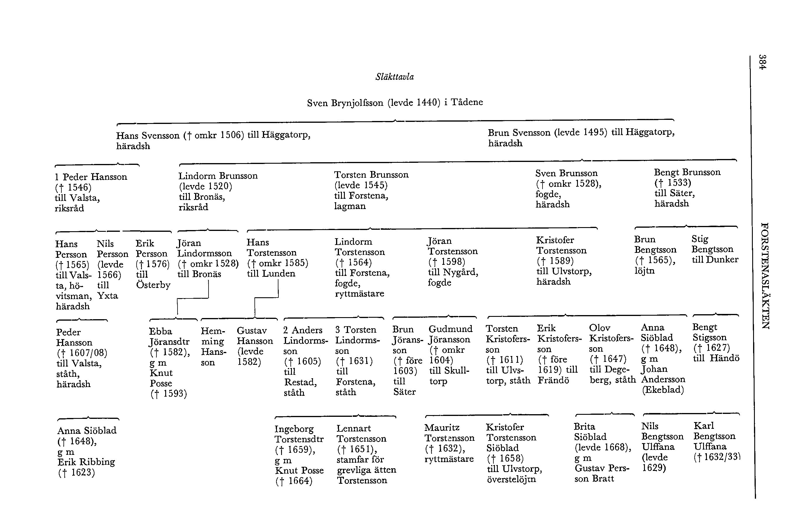 Längst av Brun Svenssons söner levde Torsten Brunsson (nämnd ännu 1545). Han kom i besittning av Forstena i V Tunhem (Älvsb) genom äktenskap med häradshövdingen i Väne hd Gudmund Torbjörnssons dotter Anna (halvsyster till Anna, g m Anders Eriksson [Ekeblad av Hedåker]; Genealogica 2, p 11, 165). Hon härstammade på mödernet från väpnaren Tore Byting (levde 1439). Över dennes ättlingar finns en i slutet av 1500-talet nedtecknad genealogi, som är en viktig källa för kunskapen om denna gren av F. Torsten Brunsson var en av de västgötaherrar som efter upproret 1529 förliktes med Gustav I, varefter han till 1538 var lagman i Värmland efter den avrättade Nils Olsson (Vinge). År 1540 uppträder han som ett av de fyra biråden i den s k regementsordningen för Västergötland och 1524, 1532 och 1543 satt han i slottsloven på Älvsborg.