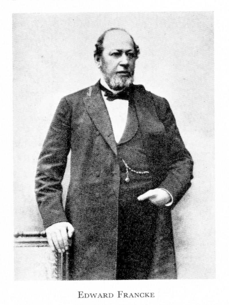 1 Francke, Johan Edward, f 17 maj 1824 i Gbg (Kristine), d 21 aug 1891 på sitt sommarställe Skepparholmen i Boo (Sth; enl dödbok för Jak, Sthlm). Föräldrar: grosshandl Johan F o Anna Christina Beata Bogren. Handelsbetjänt i Gbg hos A H Evers & Co aug 1840–febr 1842 o hos grosshandl J E Geijer febr 1842–jan 1846, fick burskap som grosshandl där 30 jan 1846, innehade där tillsammans med Josua Braune firma Francke & Braune 31 jan s å–1864, revisor för Gbgs sundhetsnämnd 1856–59, led av kommittén för tillbyggnad av Fässbergs (Göt) kyrka 9 maj 1858, av kommittén för inköp av gasverket i Gbg 1859, av Fässbergs skolhusbyggnadskommitté 13 juni 1859–20 maj 1861, jämte V Kjellberg disponentdirektör för Gällivare ab i Sthlm 30 april 1861–1864, led av bestyrelsen för Luleå Kanalab 3 jan 1863–29 mars 1864, av styr för Hörneå ab i Sthlm 1869–91, för Gideå & Husums ab i Gideå sn (Vnl) 1874–91, o för Sågverks- o trävaruexportfören från 1875, disponentdirektör för Kungsgården-Mariebergs ab i Bjärtrå (Vnl) 1886–91. RVO 1887.