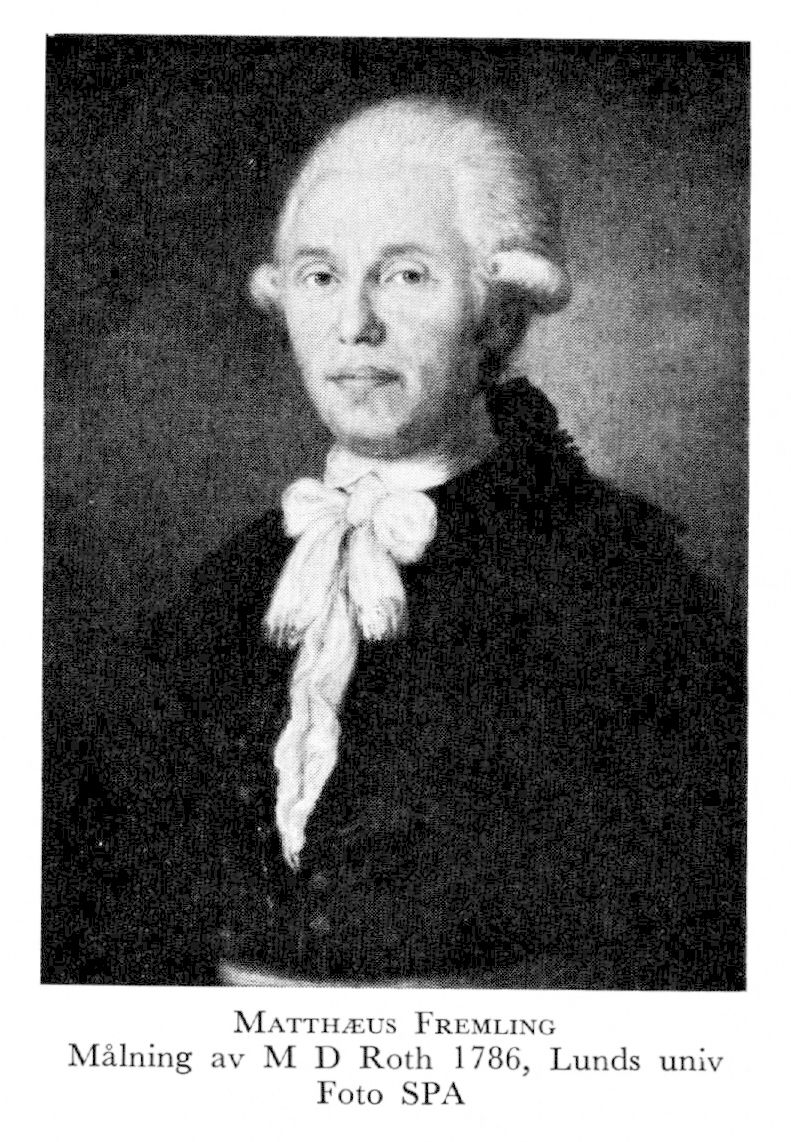 Fremling, Matthaeus, f 17 okt 1744 i Malmö (S.t Petri), d 20 juli 1820 i Lund. Föräldrar: tobaksfabrikören o handlanden Hindrich Laurentius F o Ingeborg Falck. Elev vid Malmö skola 1756, inskr vid Lunds univ 26 aug 1762, vid Greifswalds univ 24 juni 1770, disp pro exercitio där 23 o pro gradu 24 juli s å, docent i fysik vid Lunds univ 16 febr 1771, informator hos riksrådet greve F Ribbing i Sthlm 1773–77, adjunkt i filosofi vid Lunds univ 22 jan 1777 (tilltr 1779), prof i teoretisk filosofi där 27 sept 1782 (tilltr 16 nov s å), erhöll K M:ts förordn att även föreläsa i pedagogik o didaktik 19 juni 1802, univ:s rektor 1794 o 1803. LFS 1773 (ordf 1785–86), RNO 1800. – Ogift.