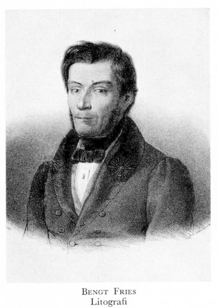 1 Fries, Bengt Fredric, f 24 aug 1799 i Hällestad (Malm), d 7 april 1839 i Sthlm (Ad Fredr). Föräldrar: stadsfysikus Andreas Peter F o Helena Elisabeth Holst. Inskr vid Lunds univ ht 1810, hovrättsex i Jönköping 1819, mag 20 juni 1823, doc i naturalhist 21 april 1824, amanuens vid zoologiska museet i Lund s å, extra bataljonsläk vid Skånska dragonreg 1826–29, med lic i Lund 16 juni 1827, doc även i anatomi där 13 aug 1828, tf prof i zoologi där hösten 1829–1831, tf reg:läk vid Skånska dragonreg 5 maj 1830–1831, intendent med prof:s n h o v vid Naturhist riksmus i Sthlm 11 maj 1831, företog ett flertal studieresor i Sverige o utlandet från 1816. – LFS 1824, LLA 1832, LVVS 1836, LVA 1837, led av flera uti lärda sällsk.