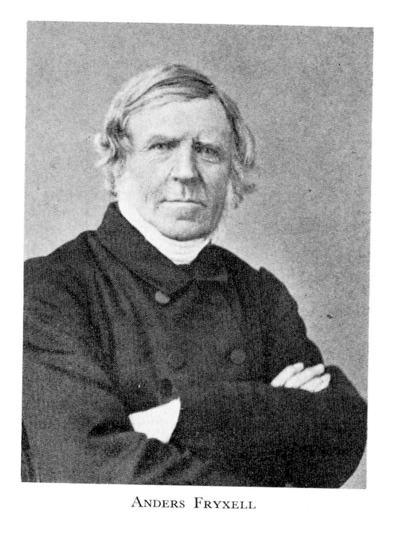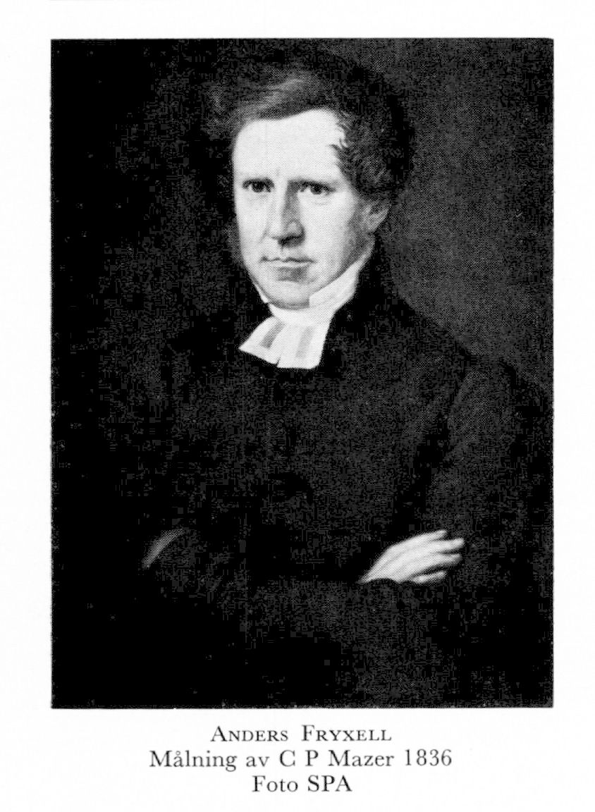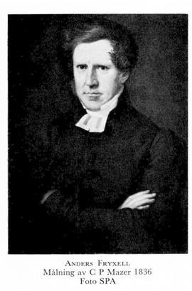 1 Fryxell, Anders, f 7 febr 1795 i Edsleskog (Älvsb), d 21 mars 1881 (enl dödbok för Sunne, Värml) i Sthlm. Föräldrar: kontraktsprosten Mathias F o Eva Lovisa Ekman. Inskr vid Uppsala univ 26 febr 1813, lär i A A Afzelius' ensk skola i Sthlm 1817, fil kand i Uppsala 9 juni 1819, vik lär vid K Djurgårdsskolan i Sthlm 1 nov s å, ord 12 okt 1820, prästv 3 juni s å, mag i Uppsala 14 juni 1821, kollega vid Maria h lärdomsskola i Sthlm 4 juli 1822, pastoralex 11 dec 1824, led av kommittén för överseende av rikets allm undervisningsverk 1826, rektor vid Nya elementarskolan i Sthlm 27 dec 1827, vik rektor vid Maria h lärdomsskola där 29 jan 1828, ord 15 april s å, rektor vid Wallinska flickskolan där 1831, erhöll årl statsanslag för fortsatt utg av »Berättelser ur sv historien» 1831–36, prof:s n h o v 1833, kh i Sunne 19 juni 1835 (tilltr 1 maj 1836), prost över Fryksdals kontrakt 1 juni 1836 o därjämte över Älvdals kontrakt 1 febr 1837, teol dr 14 juni 1845, uppförd i 2:a rummet vid biskopsval i Karlstads stift 1859 men avböjde. – Led av dir för Sällsk för växelundervisningens befrämjande o dess arkivarie 1823–35, led av sällsk Pro Fide et Christianismo 1830, SA:s stora pris s å, KorrespLSkS 1831, LSkS 1832, LVHAA 1834, LNO 1839, LSA 1840, LVA 1847, KNO1kl 1850.