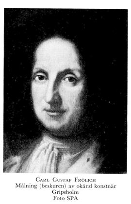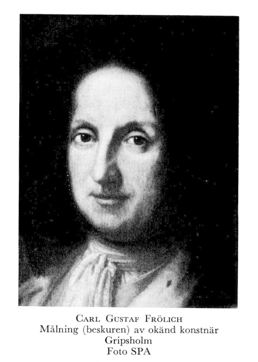 1 Frölich, Carl Gustaf, f 1637, d trol 4 mars 1714 i Sthlm (själaringn i Nik o Ty 5 mars). Föräldrar: översten Hans Christoffer F o Elisabet v Plessen. Kornett vid överste Wolmar Wrangels kav:reg 21 aug 1665, kaptenlöjtn vid Kalmar reg 26 febr 1670, kapten vid Jämtlands reg, major där 10 juli 1676, överstelöjtn:s titel o kommendant på Bohus fästning 30 sept s å, överstes titel 10 aug 1678, kommendant på Marstrand 23 okt 1679, natural sv adelsman 28 dec 1682, generalmajor av infanteriet 23 dec 1693, landsh över Västernorrland, Jämtland o Härjedalen s d, överste för Hälsinge reg 16 maj 1698, guvernör i Riga 10 mars 1700, generallöjtn av infanteriet s d, chef för Garnisonsreg i Riga, frih enl uppg 1700 (Marks v Würtemberg), i varje fall senast maj 1701 (Livonica), generalguvernör i Riga 7 april 1702, general av infanteriet 9 jan 1704, k råd o president i Dorpats hovrätt 27 dec 1705, greve 21 juni 1706 (Stiernman).