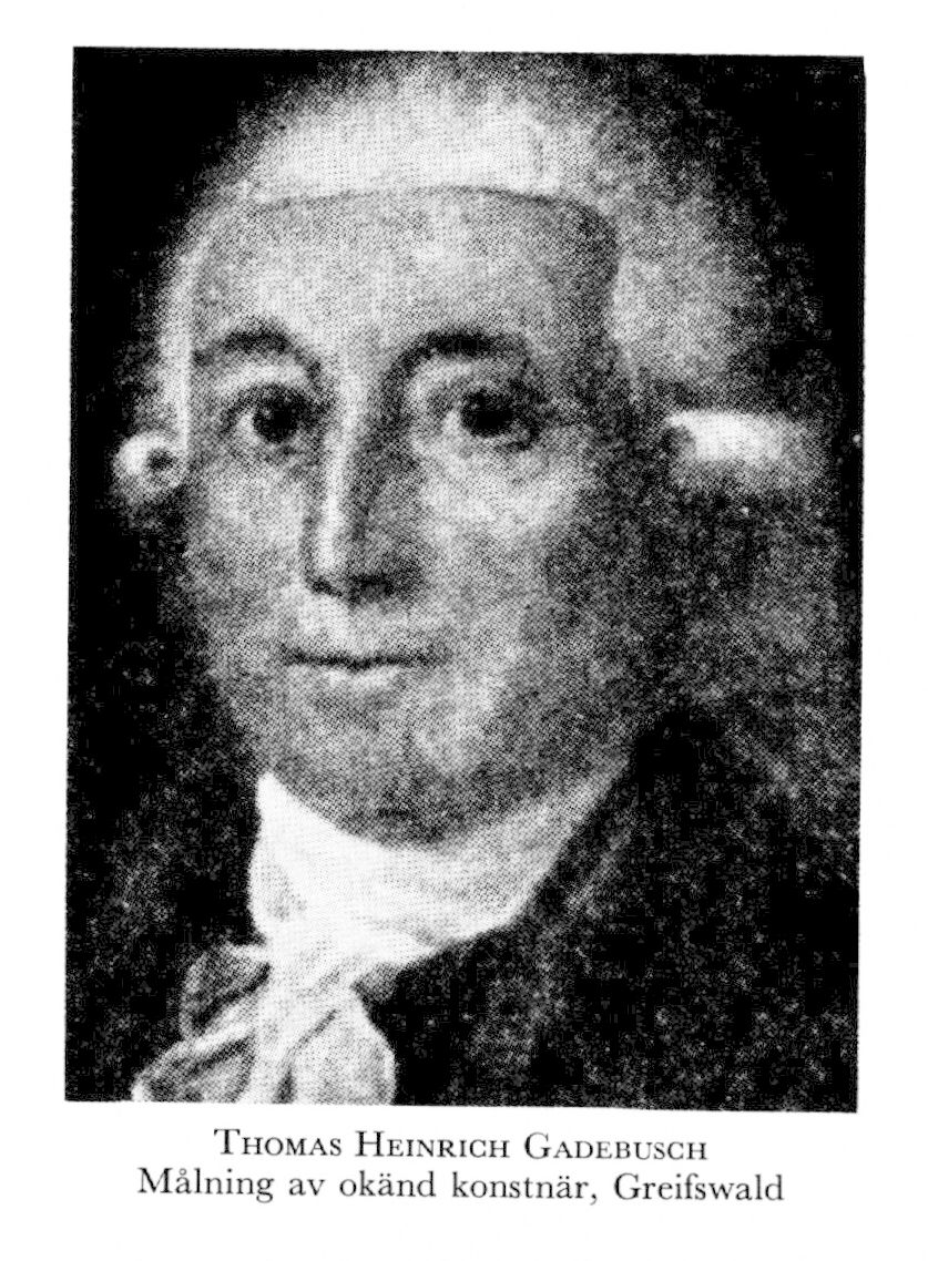 Gadebusch, Thomas Heinrich, f 11 aug 1736 i Stolp, Hinterpommern, d 2 april 1804 i Sthlm (Ty). Fader: metallproberaren vid Pfundkammer i Stralsund Lorenz G. Gymnasist i Stralsund 1745–52, inskr vid Greifswalds univ 15 juni 1754, vid Göttingens univ 14 april 1755, docent vid Greifswalds univ 1758, mag där 1759, sekr vid pommerska inrättningskommissionens visitation av pommerska hovrätten 1768, sekr hos 1770 års kommission vid visitation av consistorium ecclesiasticum o Greifswalds akademi, tjänstgörande vid guvernementssekretariatet i början av 1770-talet, prof i tysk o pommersk statsrätt vid Greifswalds univ 7 okt 1772, biträde vid pommerska kammarens undersökningar i Stettinarkivet rörande matrikelverket 1794–95, led av pommerska visitationskommissionen o samtidigt kansliråds n h o v 21 maj 1796, led av allm statsberedn i Sthlm 26 sept 1797 o i pommerska beredn i nov 1798. Led av Upfostrings-sälskapet 1786.