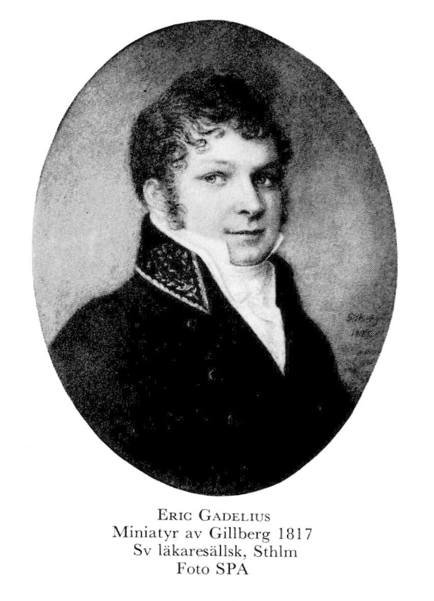 1 Gadelius, Eric, f 16 juli 1778 i Sthlm (Maria), d 2 febr 1827 där (Klara). Föräldrar: notarien vid stadsauktionskammaren Sven Veddig G o Catharina Elisabeth Holmen. Elev vid Lyceum i Sthlm 1789, inskr vid Uppsala univ 6 okt 1795, disp pro exercitio där 3 mars 1797, med fil ex där 6 mars s å, inskr vid Åbo akad 19 okt 1799, ex theoreticum där 16 maj 1800, ex practicum där 13 juni s å, läk vid Krigsakad på Karlberg 13 febr 1801–11 okt 1810, kir mag i Sthlm 6 maj 1802, disp pro gradu vid Åbo akad 12 juni s å, med dr där 14 juni s å, läk vid Sabbatsbergs fattighus o hälsobrunn 28 okt 1803, anatomiae prosektor i Sthlm okt 1805–febr 1811, läk vid Sabbatsbergs brunnslasarett 1807, sekr i Sv läkaresällsk 1808–12 o 1818–21, prof:s n h o v 11 okt 1810, prof i teor medicin o kirurgi vid sedermera Karol inst 14 febr 1811, uppehöll även professuren i prakt medicin 6 april 1813–juli 1815. – Led av Finska hushålln:sällsk 1800, LPS 1805, led av samf Pro Patria 1815, LVA 1817 (preses 1824–25), RVO 1818.